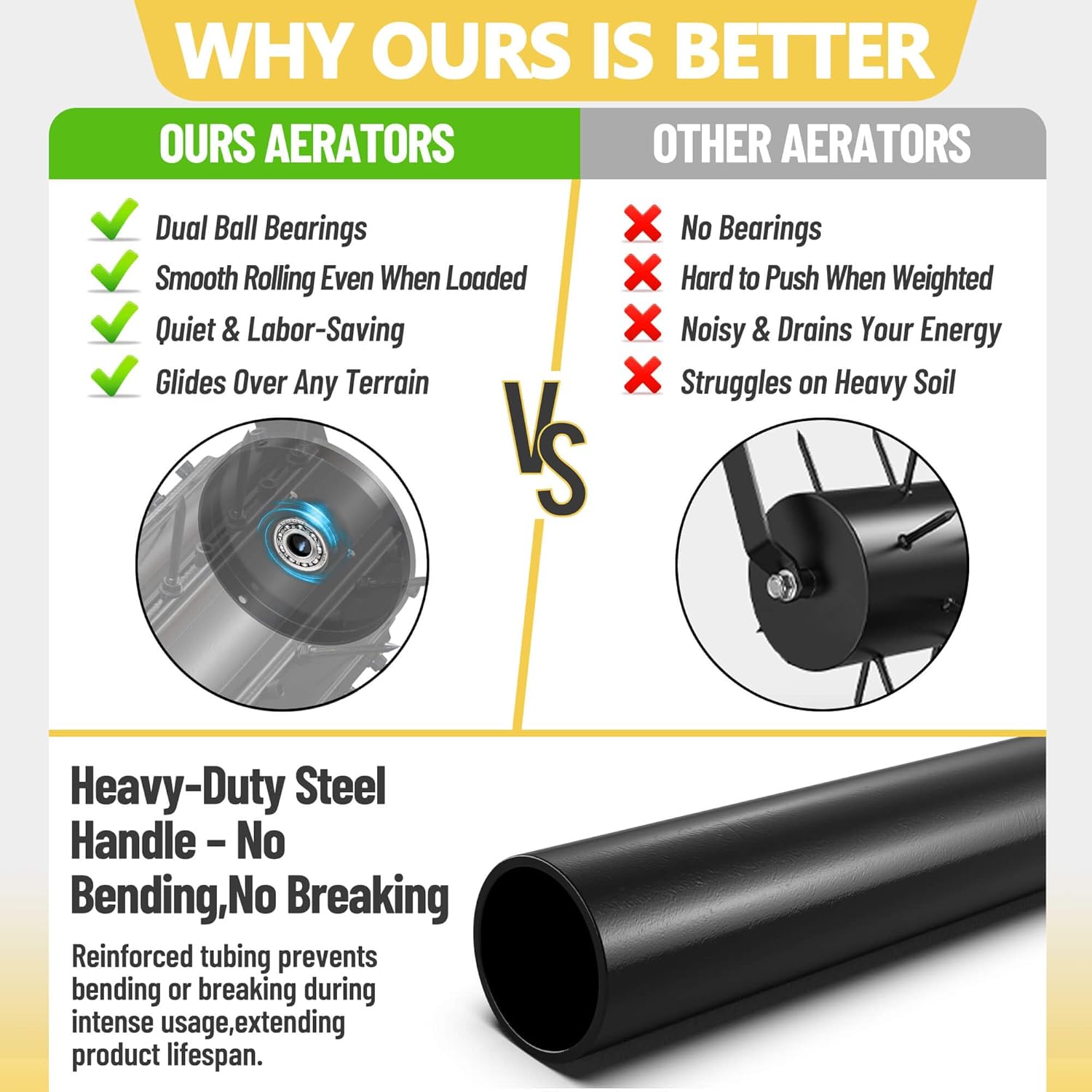 - Dual Bearing System + Fillable Drum – Designed for Real-World Tough Soil: Smooth-rolling dual ball bearings on both sides prevent wobbling and reduce drag — even on uneven terrain. The hollow drum can be filled with sand or gravel to increase weight, helping the 2" spikes penetrate hard-packed soil with ease.