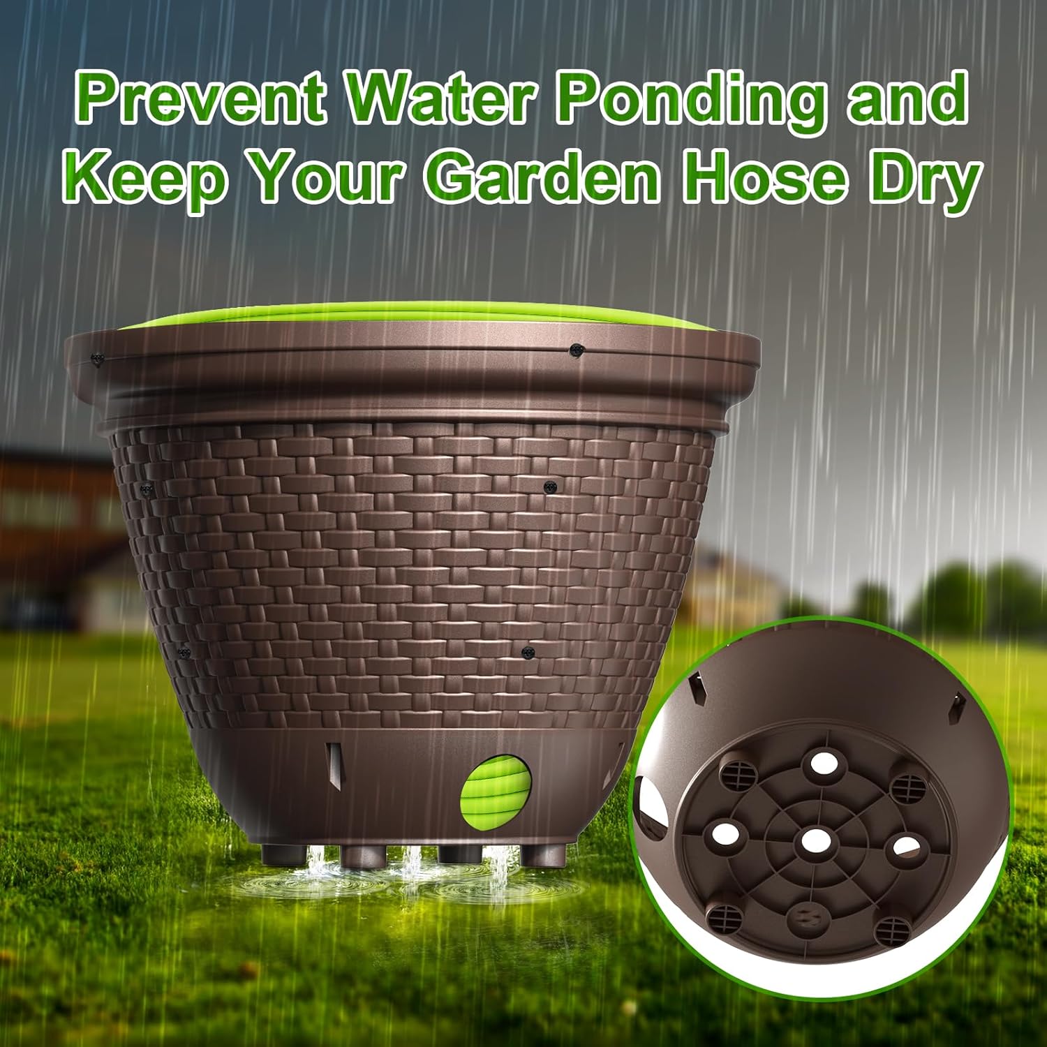 - 【Elegant & Decorative Hose Storage】: The Riokko garden hose holder features a stylish wicker-style design that seamlessly blends into your garden, patio, backyard, or garage. This decorative hose pot not only hides your hose but also enhances outdoor aesthetics with its natural charm. Perfect for storing 100 ft garden hoses while keeping your space tidy