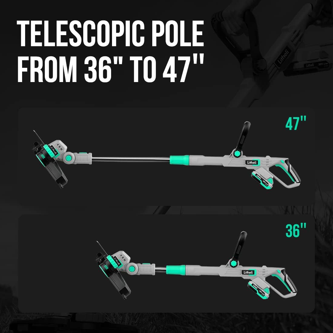 - Telescopic pole can be adjusted without tools to reach any length between 36" and 47"