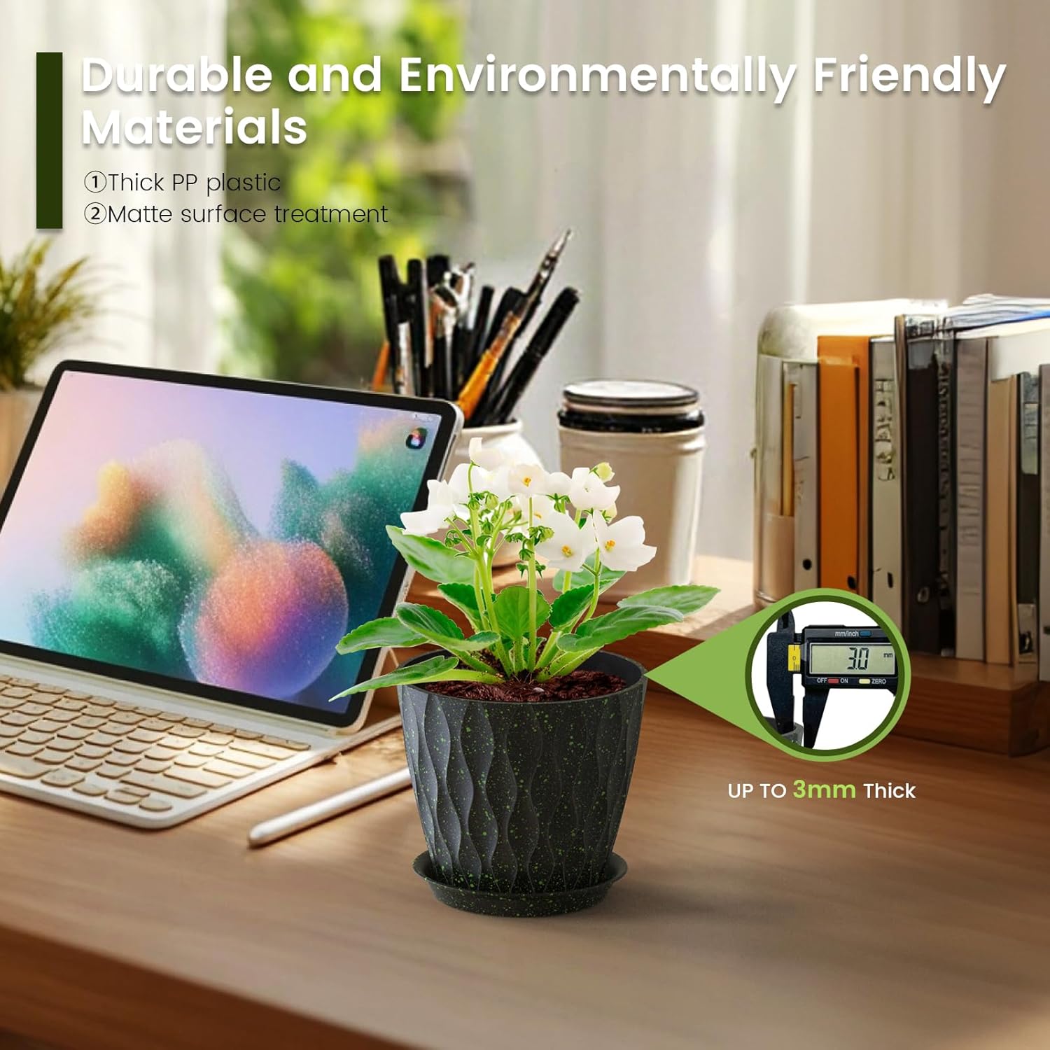 5 inch Plant Pots for Indoor Outdoor Plants, 6 Pack Thick Nursery Pots with Drainage Holes and Saucers, 3D Modern Wave Texture Small Plastic Planter Flower Pots, Black with Green Speckles