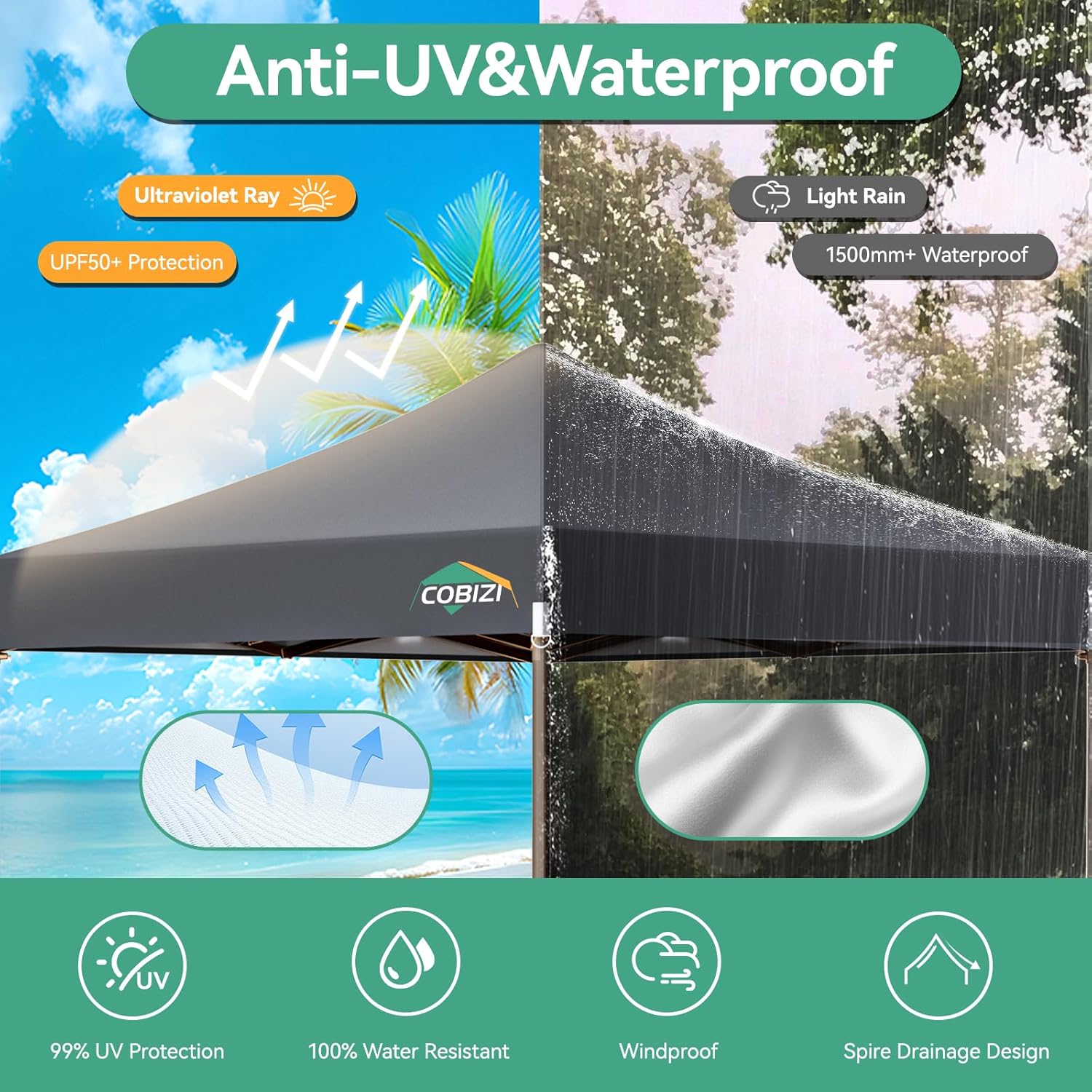- [Premium Quality Fabric] 10x15 pop up canopy tent is made of 420g waterproof oxford fabric. The top fabric is coated with two layers of PVC with heat-sealed seams waterproof strip technology, 100% waterproof and blocks 99% UV rays.PVC coated top fabric has better light transmission than other silver coated top fabrics on the market, the tent space is more transparent.