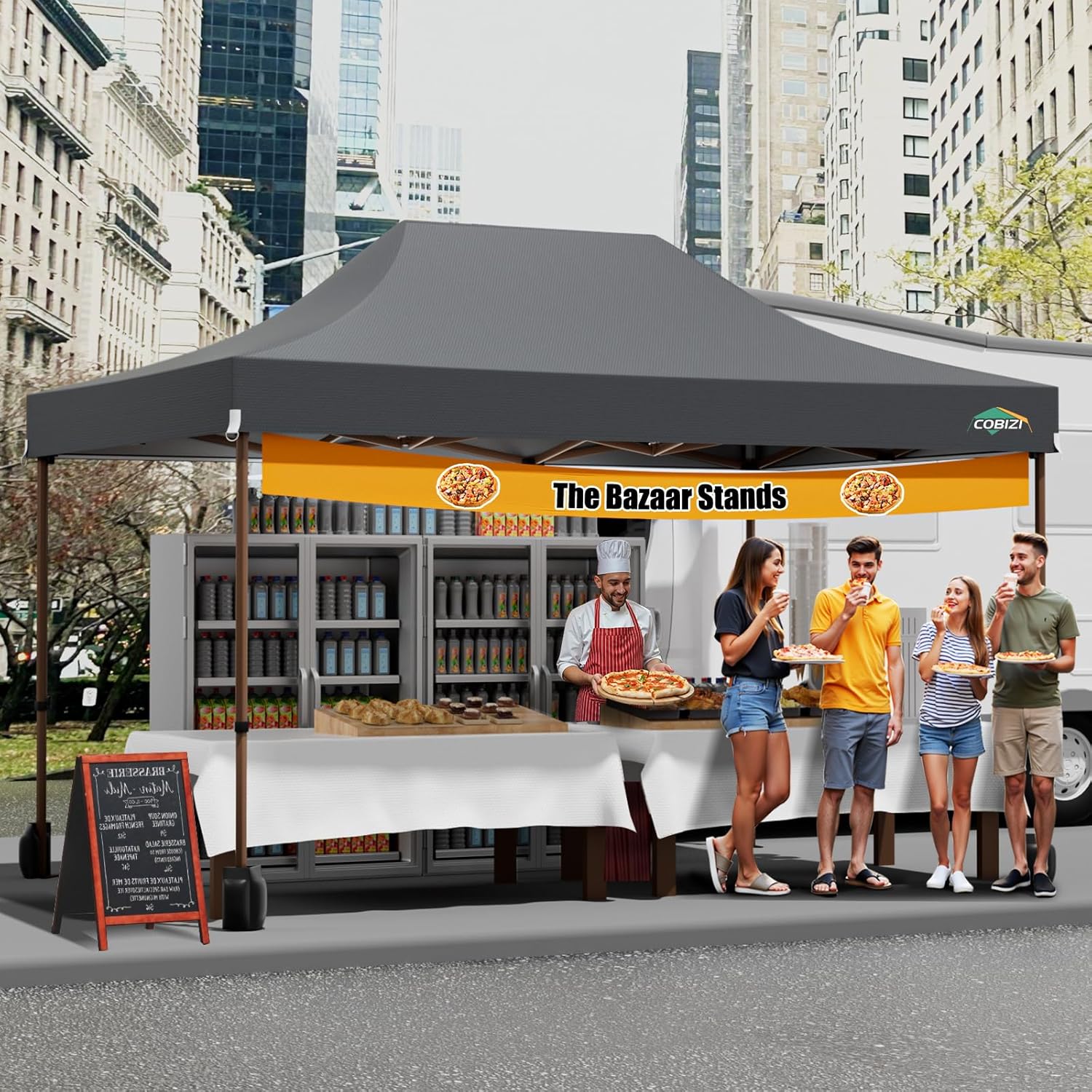 - [Upgrade Heavy Duty Canopy] The COBIZI 10x15 Heavy Duty Canopy features a commercial-grade full truss structure constructed from durable powder-coated stainless steel. The thickness of the 1.77 inch (45mm) hexagonal legs has been increased to 0.7mm/0.03 inches, providing superior stability and durability. Full truss design ensures exceptional sturdiness and rust resistance, capable of withstanding wind speeds of up to 30mph when properly secured with an number of sandbags, ropes, and stakes.