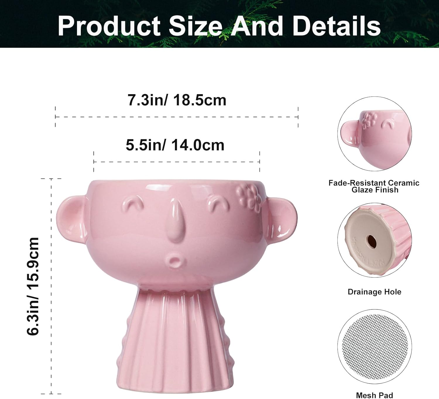 Face Pots for Plants - 7 Inch Ceramic Face Planters Pots Head for Indoor Outdoor, Small Funny Succulent Planters with Drainage Hole, House Room Apartment Decor, Gifts for Women, Bright Pink