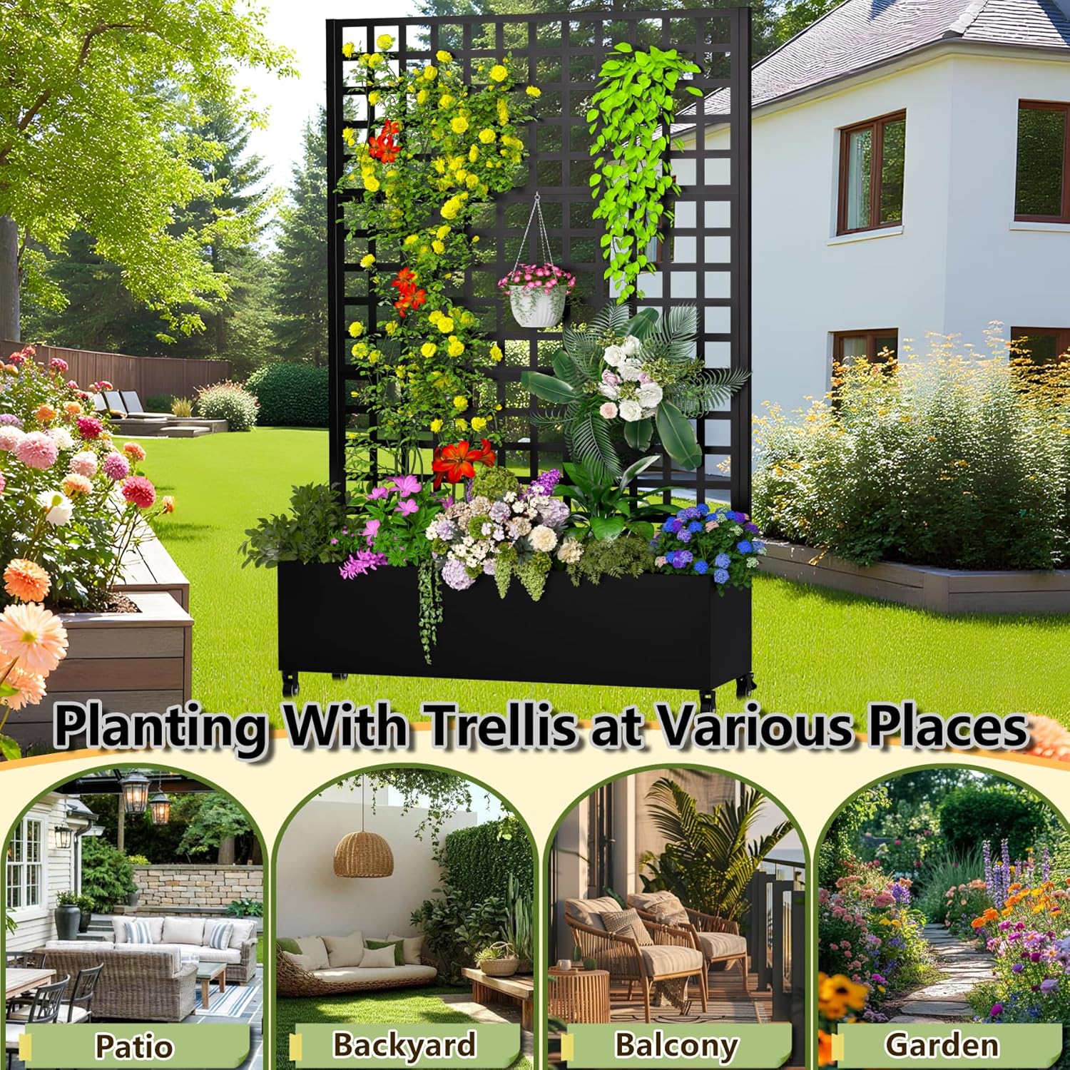 - 【3-in-1 Metal Planter Box with Trellis】This 72.1-inch high Metal Planter Box with Trellis functions as a raised garden bed for flowers, vegetables, or fruits, a strong support for climbing plants, and a stylish privacy screen. Perfect for versatile outdoor planting and decoration.