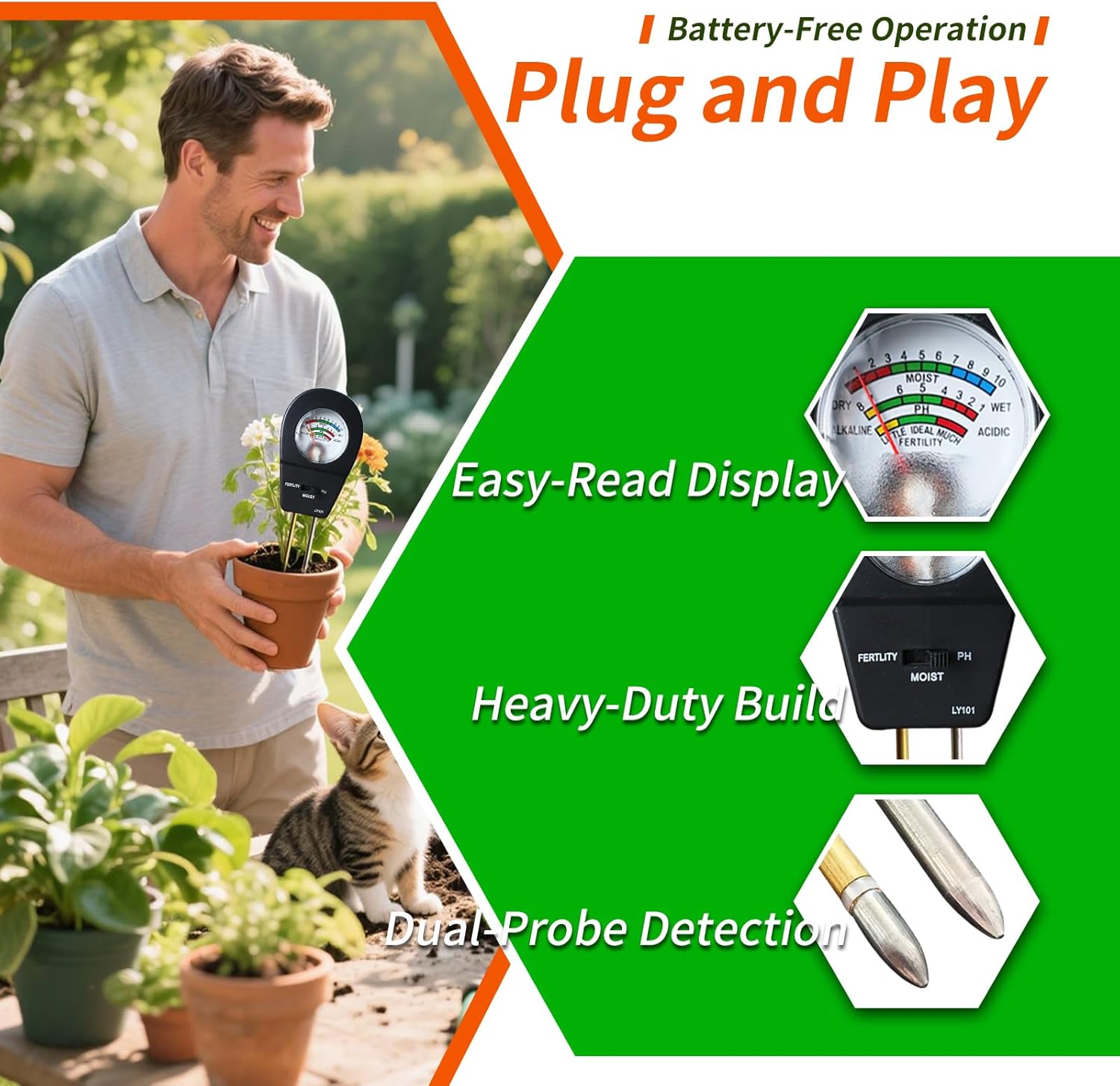 - Battery-Free Operation & Universal Garden Use:No battery is needed – eco-friendly and ready anytime! Our durable probe minimizes root damage while penetrating mixed soils (clay/sand/loam). Perfect for Indoor & Outdoor Garden, farms, patios, lawns, and all growth stages: potted plants, vegetables, flowers, shrubs, and compost. Ideal for organic gardening enthusiasts and landscape professionals alike