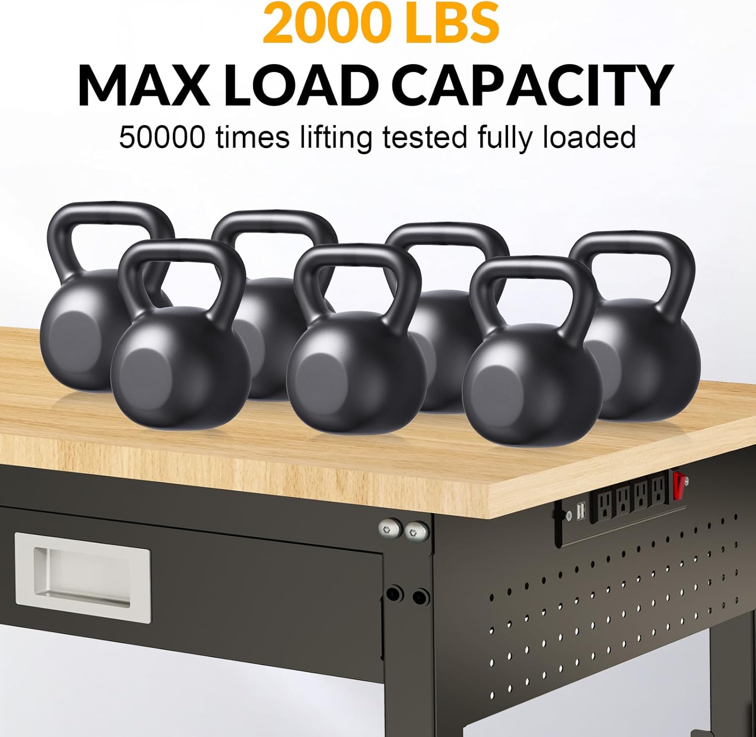 48" Workbench for Garage with Drawers Rubberwood Tabletop Work Table with Pegboard, Power Outlets Adjustable Height Work Bench for Office, Woodworking Shop, Home