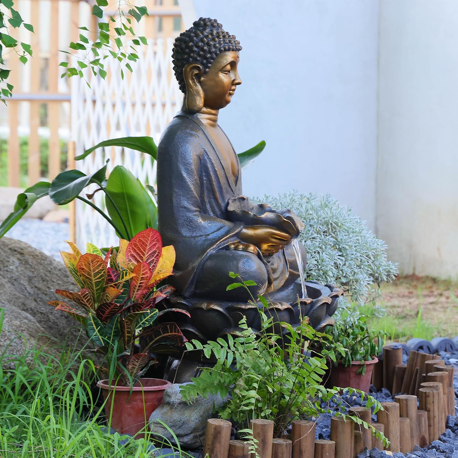 - Elegant Seated Buddha fountain - This Buddha fountain features a serene Buddha seated on a lotus base, holding a lotus leaf from which a gentle waterfall flows,Made from high-quality, weather-resistant resin, this fountain is designed for longevity and stability, ensuring it remains a cherished part of your home for years to come.