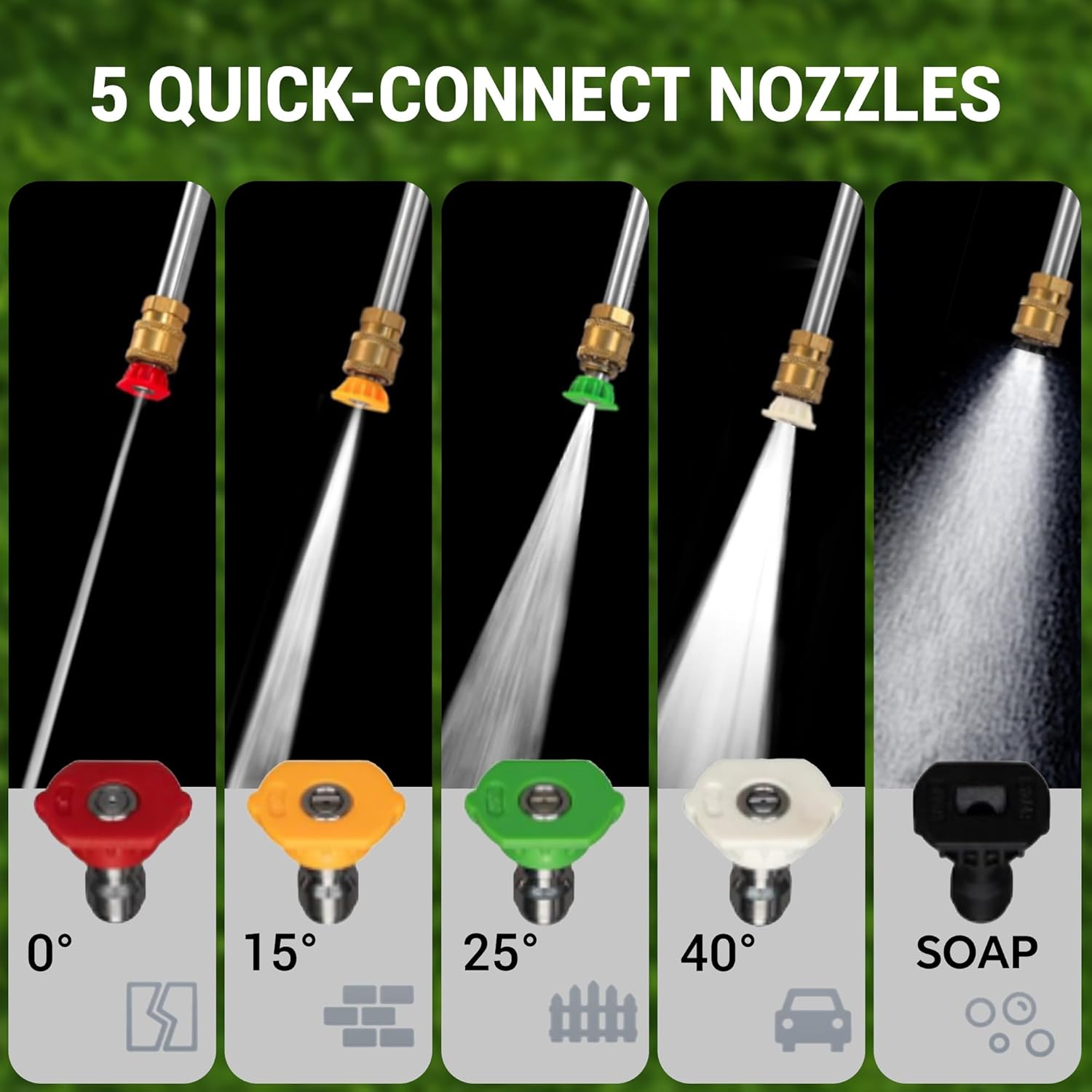 - [๐ ๐๐ ๐๐จ๐ณ๐ณ๐ฅ๐๐ฌ ๐๐จ๐ซ ๐๐ฅ๐ฅ ๐๐ฅ๐๐๐ง๐ฎ๐ฉ ๐๐๐๐๐ฌ โ ๐๐ซ๐จ๐ฆ ๐๐๐ข๐ฅ๐ฒ ๐๐จ๐ฎ๐ฌ๐ ๐๐ฅ๐๐๐ง๐ฎ๐ฉ ๐ญ๐จ ๐๐๐ซ๐ ๐ ๐๐ช๐ฎ๐ข๐ฉ๐ฆ๐๐ง๐ญ ๐๐๐ข๐ง๐ญ๐๐ง๐๐ง๐๐] Easily switch between 5 quick-connect nozzles (0ยฐ, 15ยฐ, 25ยฐ, 40ยฐ, and soap). From high-pressure jets (0ยฐ) for deep stains to gentle 40ยฐ spray for delicate surfacesโthe washer easily covers every cleaning need for gutters, driveways, home exteriors, decks, fences, furniture, cars/RV, boats, or mechanical equipment maintenance.