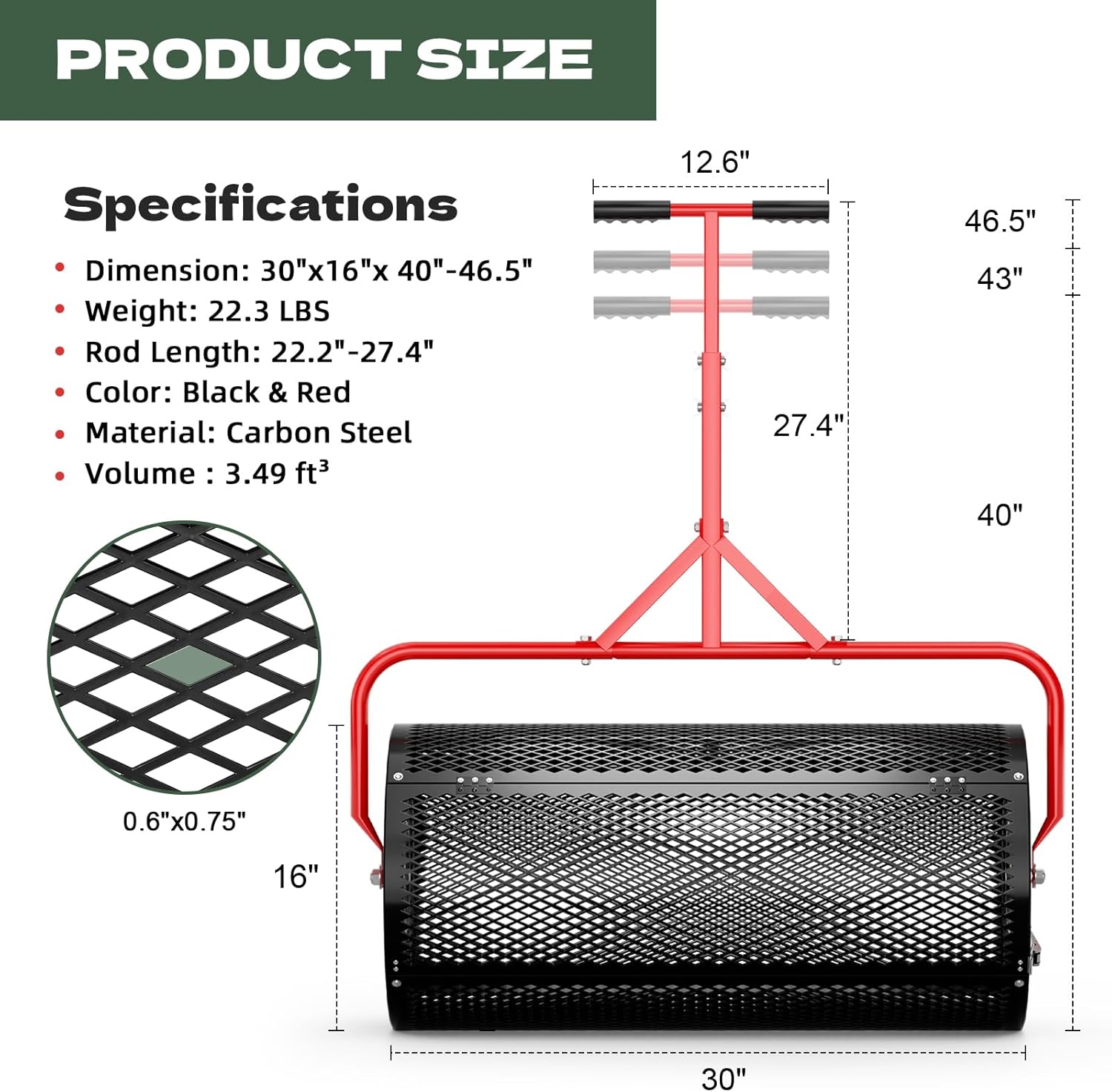 Compost Peat Moss Spreader for Lawn, 30 Inch Compost Roller Spreader with Adjustable T-Shaped Handle, Upgraded Side Clasps, Durable Lightweight Metal Roller, Lawn Garden Yard Care