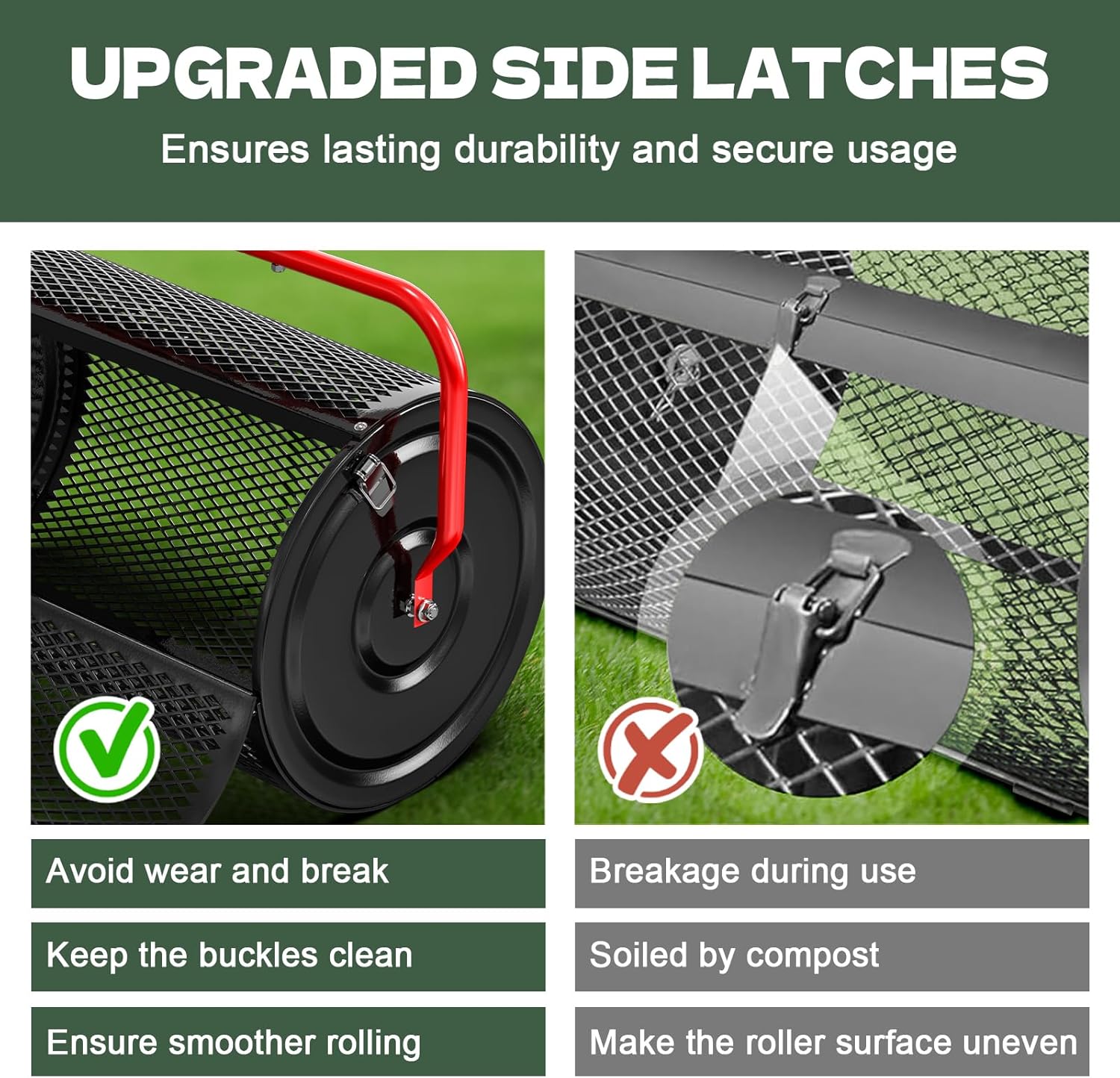 - [Uniform and Efficient Spreading] This 30 inch compost spreader for lawn is engineered for consistent and uniform spreading, enhancing garden soil structure and nutrient absorption. Equipped with a thickened diamond-shaped mesh, it ensures refined particle filtration. A must-have Compost Spreader to achieve lush, healthy lawns and gardens.