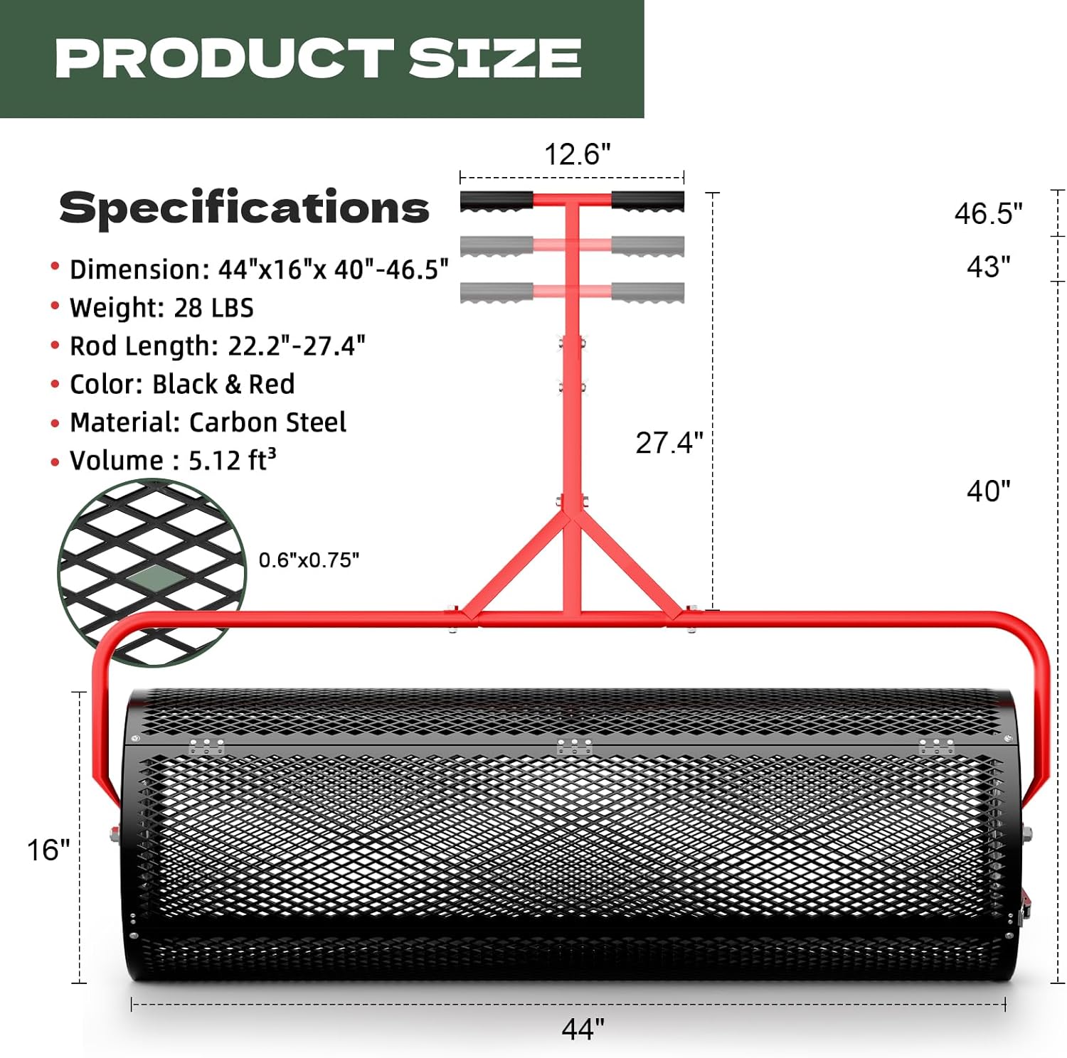 Compost Peat Moss Spreader for Lawn, 44 Inch Compost Roller Spreader with Adjustable T-Shaped Handle, Upgraded Side Clasps, Durable Lightweight Metal Roller, Lawn Garden Yard Care