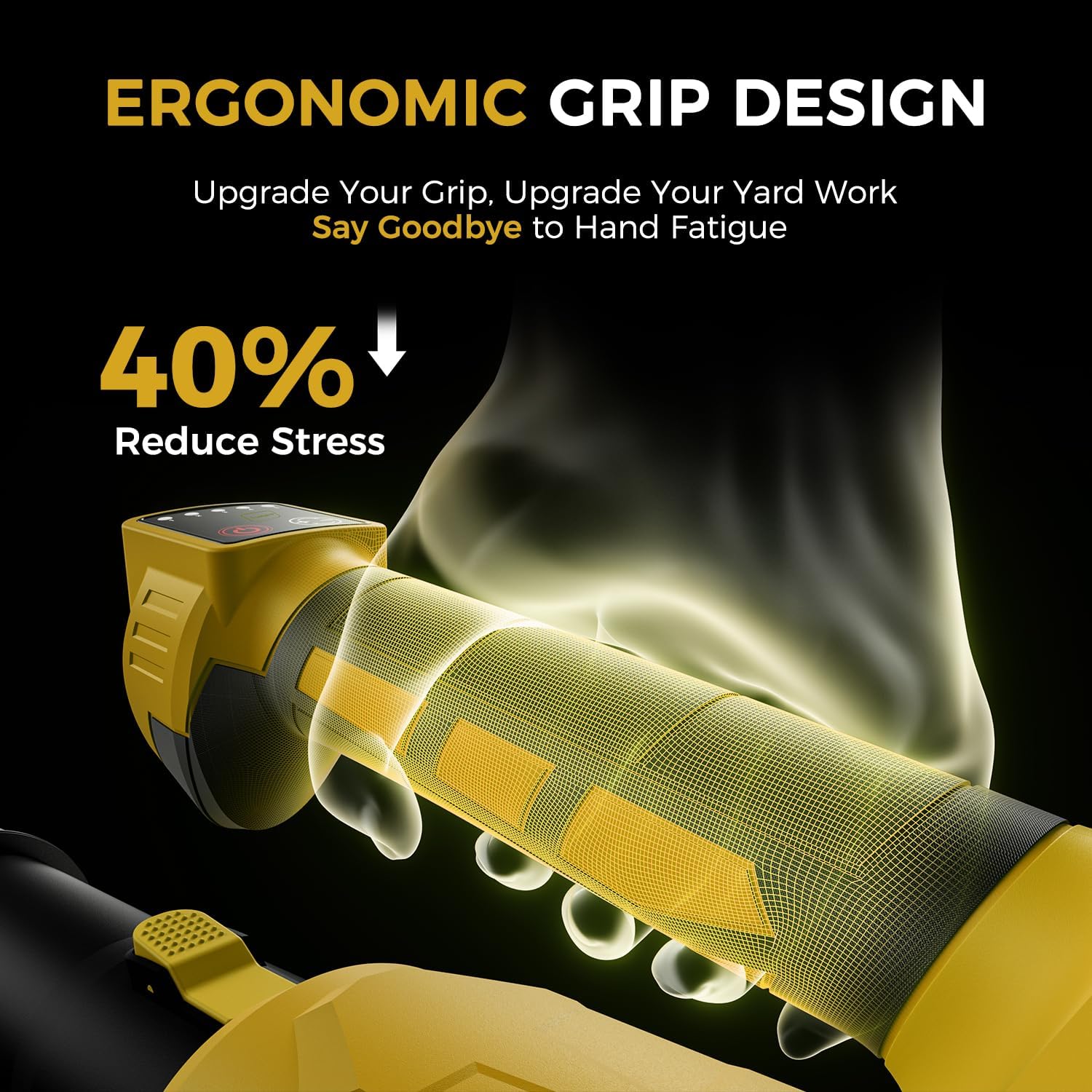 - 【Ergonomic Grip Design—Say Goodbye to Hand Fatigue】Tired of hand fatigue and discomfort while tackling yard work? Our cordless leaf blower is designed with a comfortable, ergonomic grip that reduces strain and vibration. The soft-touch grip provides steady control, even during prolonged use—say goodbye to sore hands! Perfect for homeowners who demand both power and ease of use, these blowers for lawn care help you achieve a pristine yard without the aches