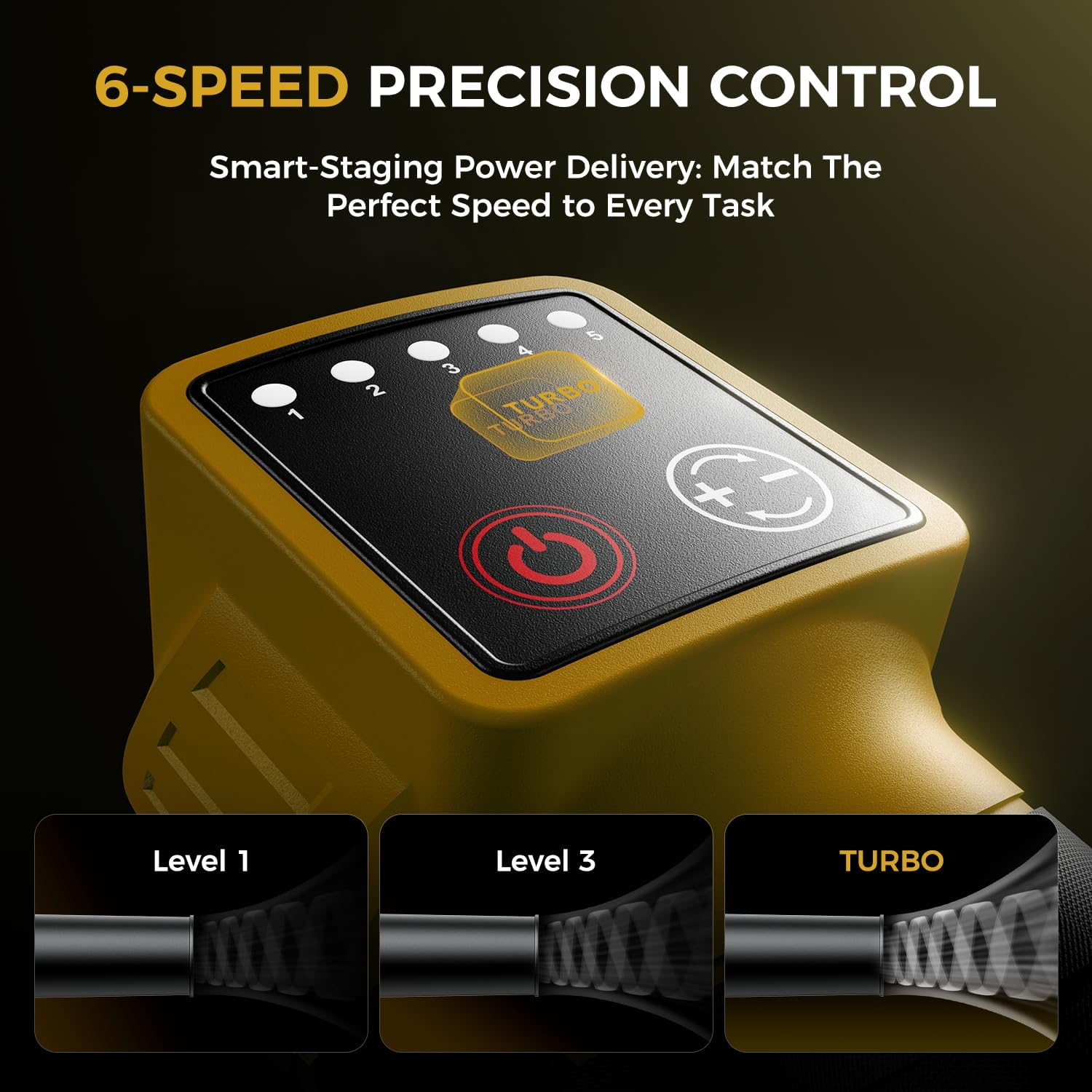 - 【6-Speed Power Settings for Every Task】Master every yard task with our professional leaf blower cordless featuring 6 precision speeds. Five adjustable settings (80-160 MPH) easily handle everything from patio dust to wet leaves, while Turbo mode delivers a powerful 180 MPH for tough debris. The 6-speed system maximizes battery life:lower speeds extend runtime for light work, while Turbo mode provides instant power when needed—giving you complete control over performance and efficiency