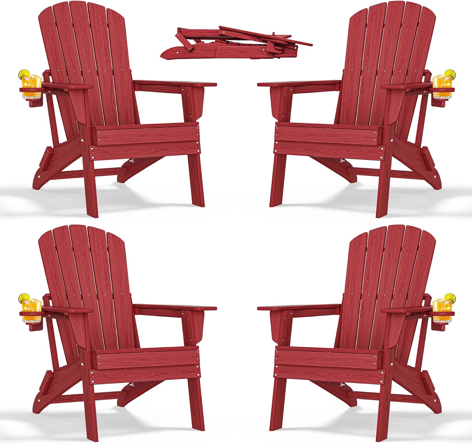 Folding Adirondack Chair with Cup Holder Set of 4, HDPE All-Weather Patio Chairs, Plastic Outdoor Chairs- Looks Exactly Like Real Wood- Red