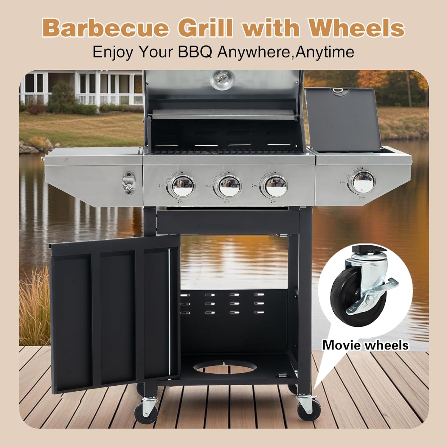 Endark 3-burner propane gas grill | 37,000 BTU stainless steel with side-fire function | with enameled cast iron grate, thermometer and side stand wheels | great for patio and garden outdoor cooking