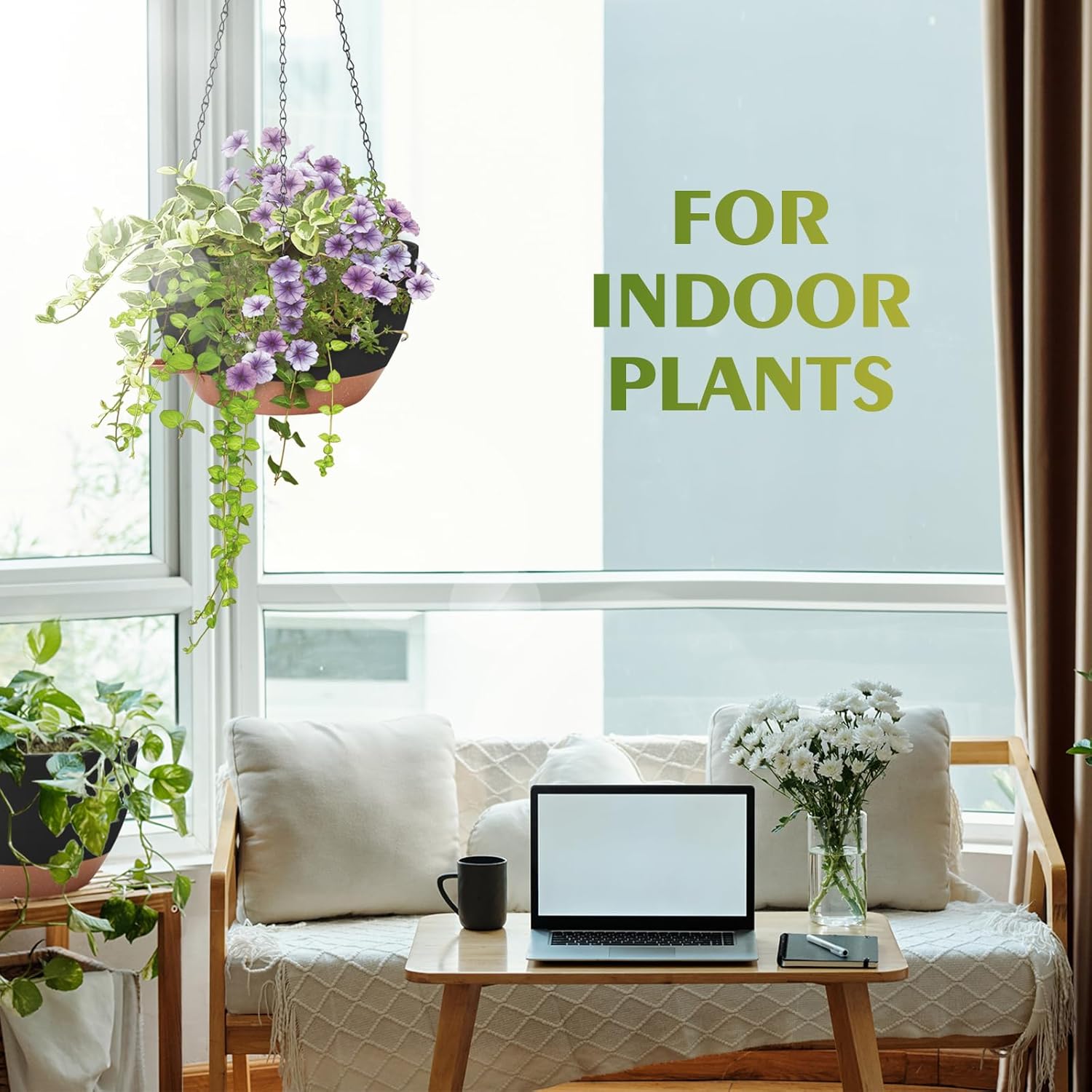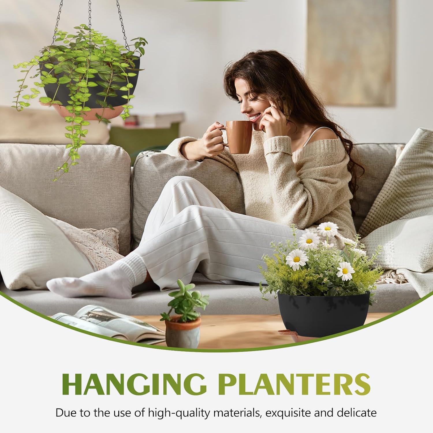 - 【Self-Watering Hanging Flower Pots with Removable Saucer】The innovative recessed design under each hanging indoor planter maintains optimal water levels for your plants and serves as a reservoir for consistent watering. This feature eliminates the hassle of watering plants while you're away on business trips or traveling, thanks to our hanging plant pot.
