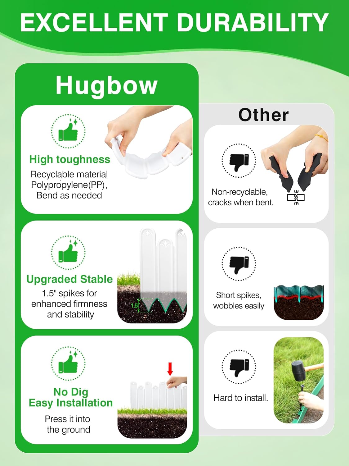 - 【Premium Garden Edging】The solid garden border edging is crafted from 100% virgin PP plastic—no recycled materials added. BPA-free, impact-resistant,and is not easy to corrode, ideal for long-term daily use. It is fully recyclable, helping to reduce resource waste.The high-tenacity design maintains its shape season after season, withstanding diverse climates (-20 °C to 80 °C) and resisting cracking, peeling, and breaking even under extreme weather conditions like rainstorms, or snowfall.