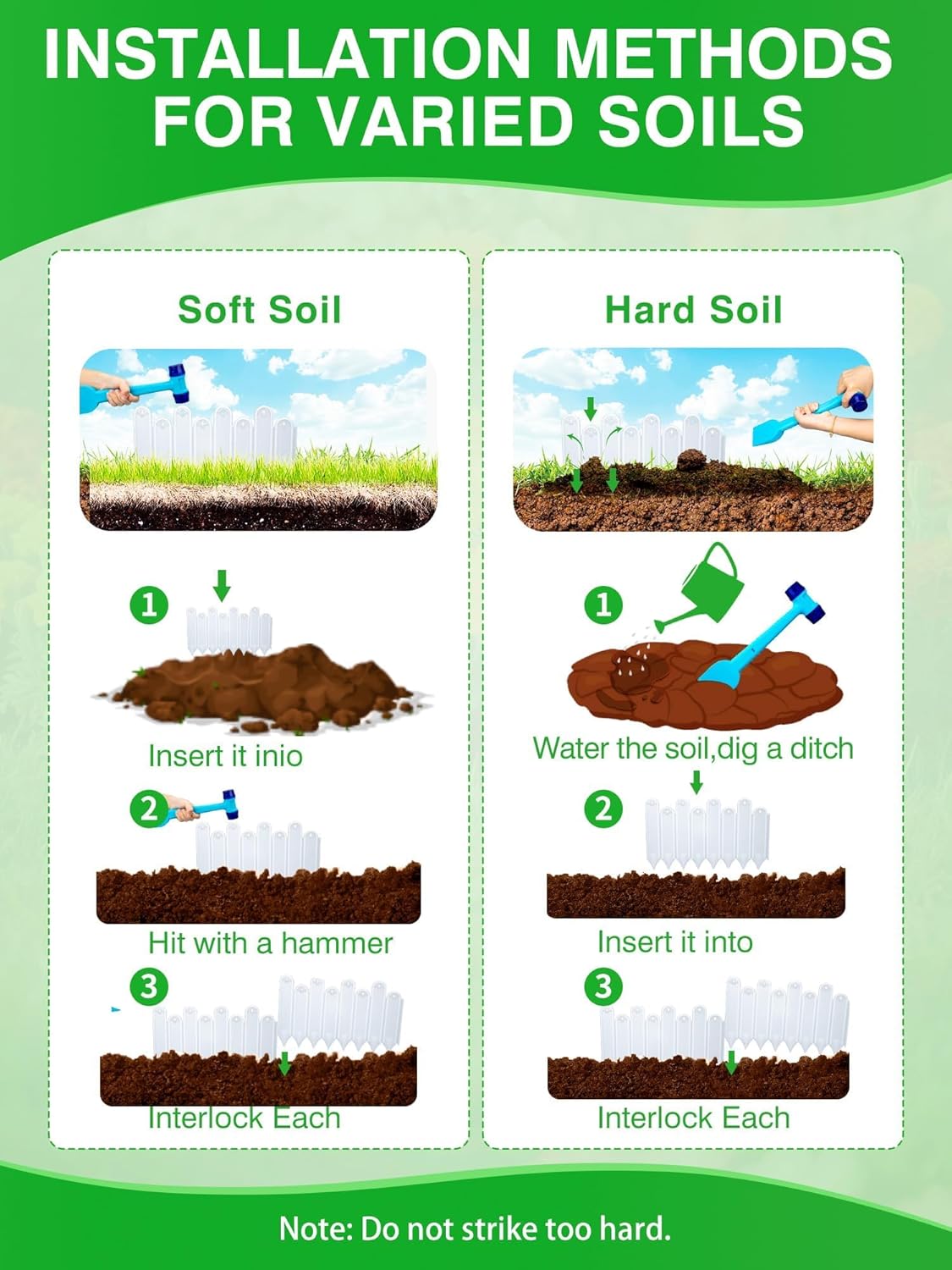 - 【Includes Installation Hammer & Safety Gloves】Our complete set comes with a dual-function installation hammer (hammer + shovel combo) and protective work gloves for easy, safe installation — no additional tools are needed, as everything required is included in the package.If the soil is loose, simply press it into the ground.This method requires no digging; if the soil is compact and has many stones, you can first dig a ditch with a shovel and then use a hammer to knock it into the ground.