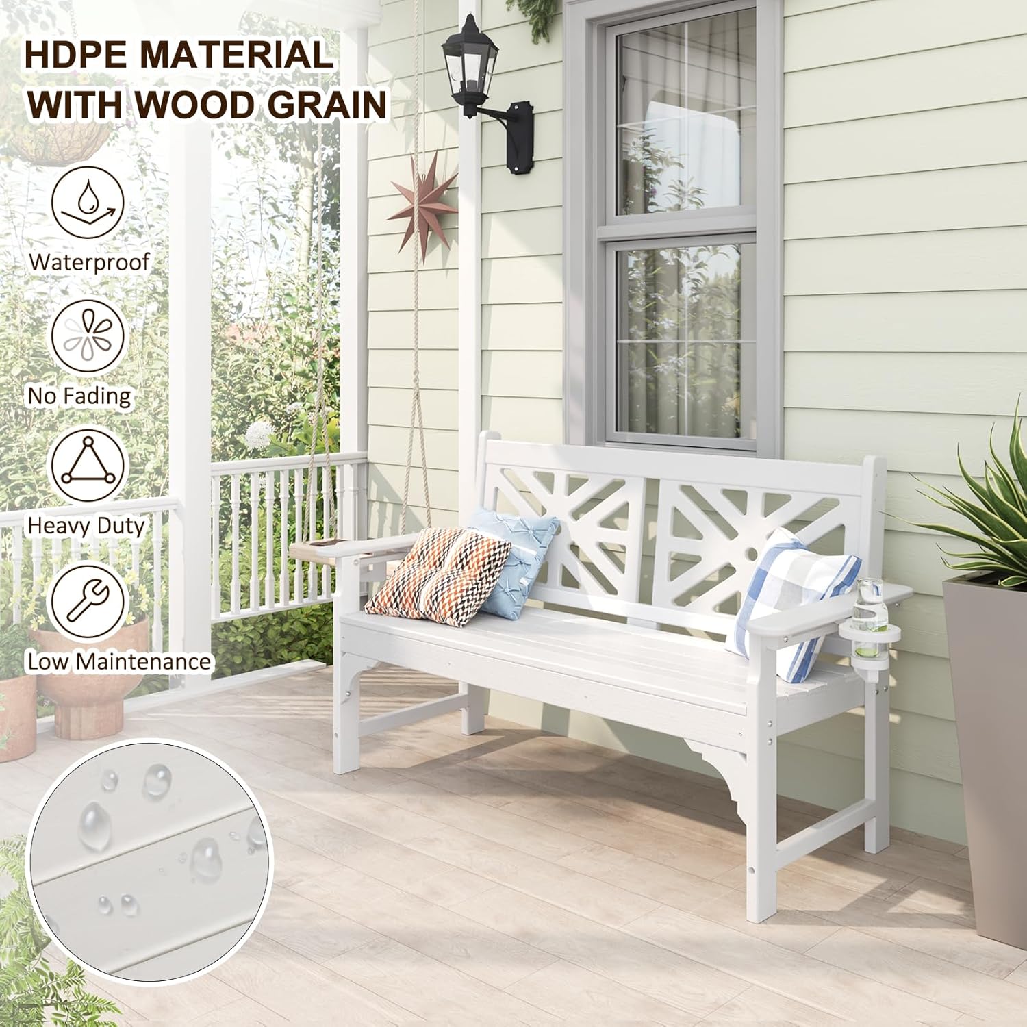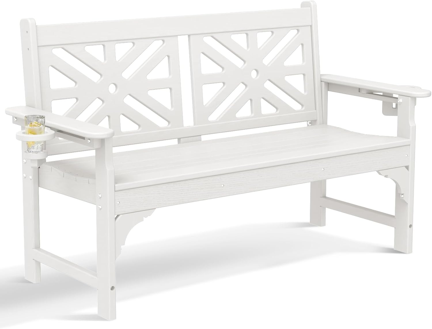 nalone Outdoor Bench with Cup Holders, HDPE All Weather Porch Bench Load up to 800 Lbs, 2-Person Garden Benches Rot-Proof Fade Proof for Patio, Porch, and Park (White)