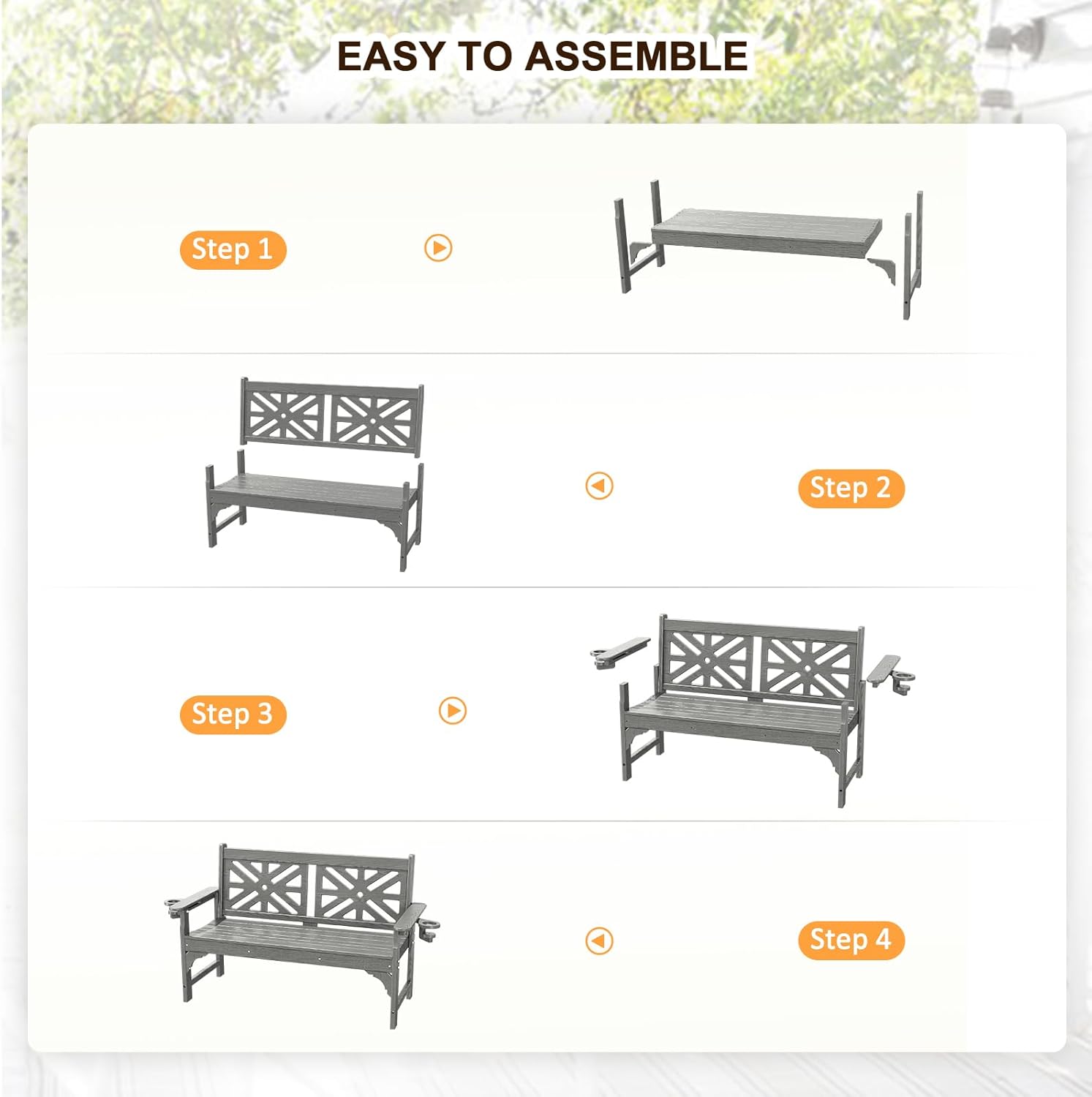 nalone Outdoor Bench with Cup Holders, HDPE All Weather Porch Bench Load up to 800 Lbs, 2-Person Garden Benches Rot-Proof Fade Proof for Patio, Porch, and Park (Grey)