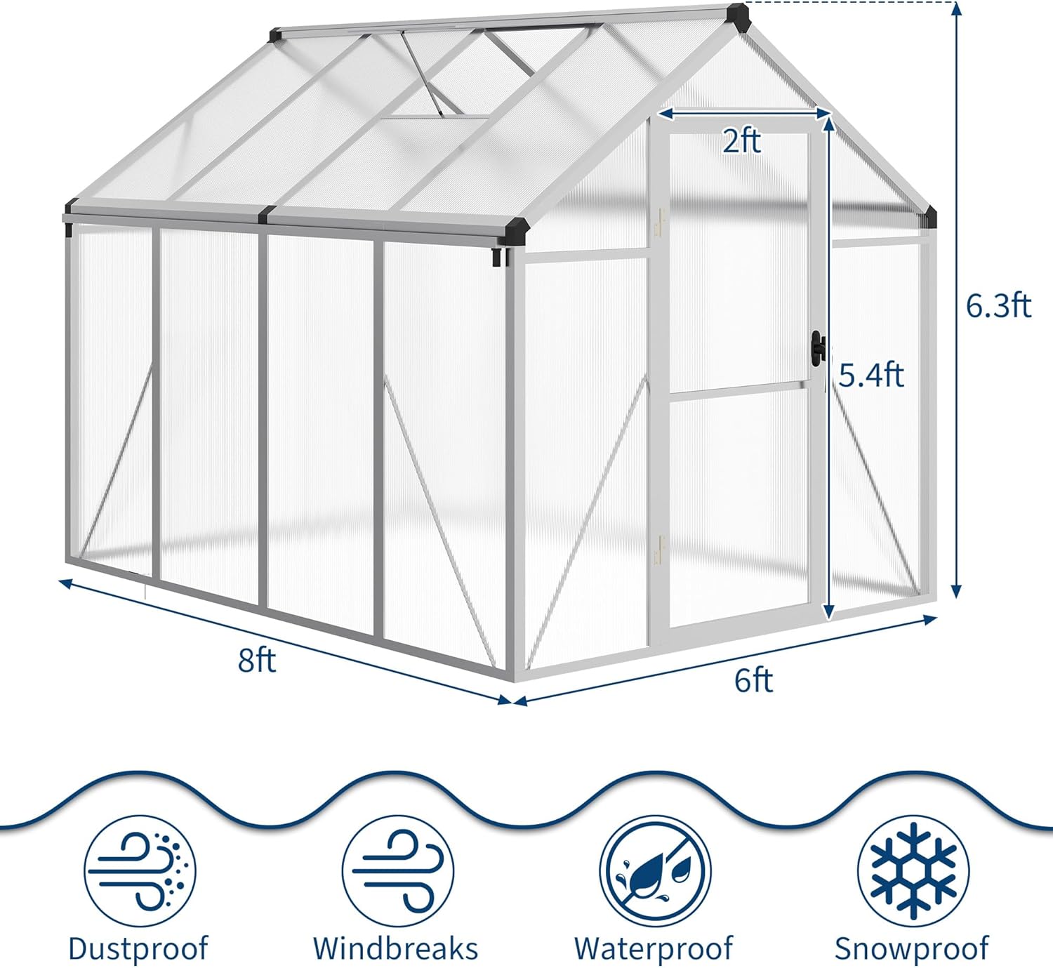 6 x 8 FT Greenhouse, Greenhouses for Outside, Polycarbonate Greenhouse with Aluminum Frame, Lockable Door and Ajustable Roof Vent for Backyard, Green Houses for Outside Garden Backyard, Patio