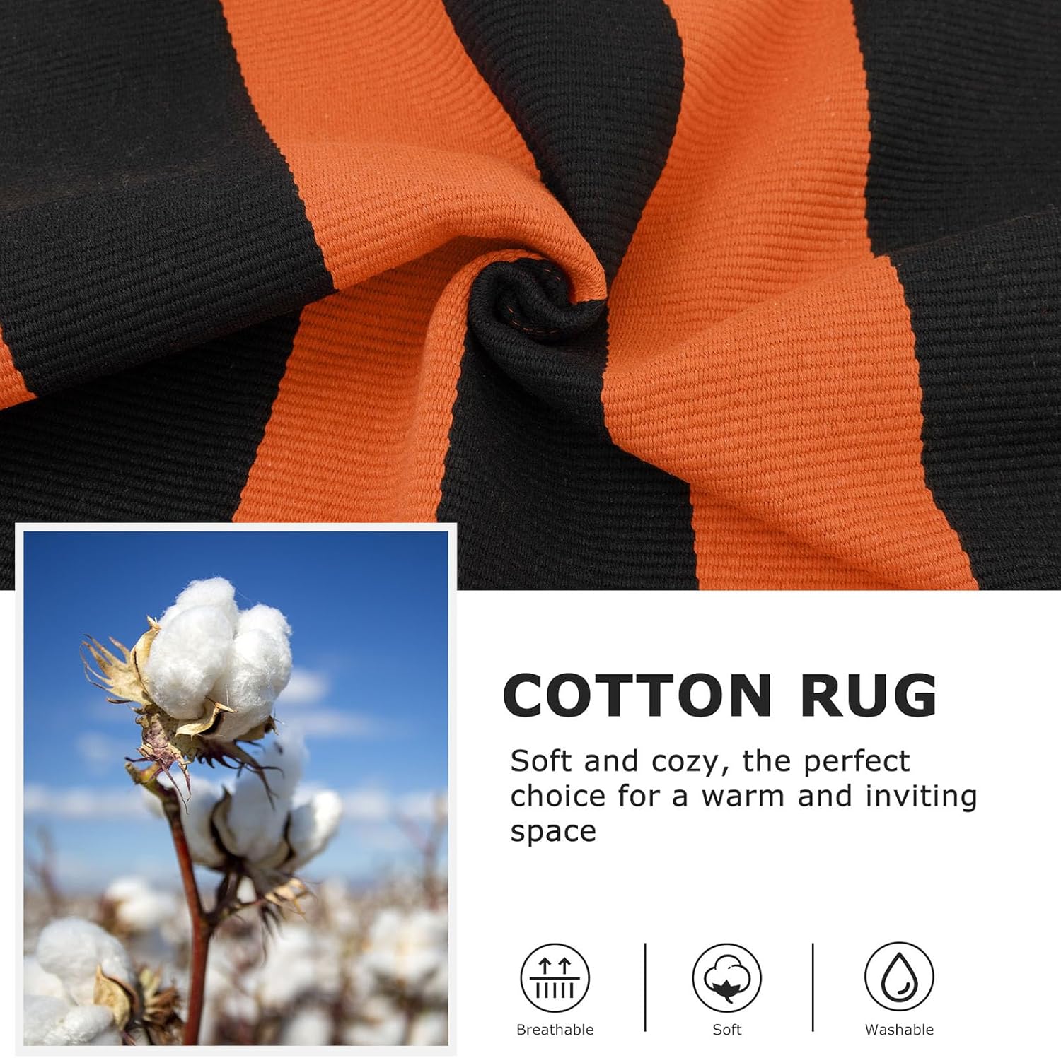 - Easy to Clean: This orange and black striped rug is simple to maintain with machine wash or vacuuming to remove dirt. The rug is sturdy and can be tumble dried on low. Keep your door rug fresh and clean with minimal effort. NOTE: Cotton rugs normally shrink slightly after washing