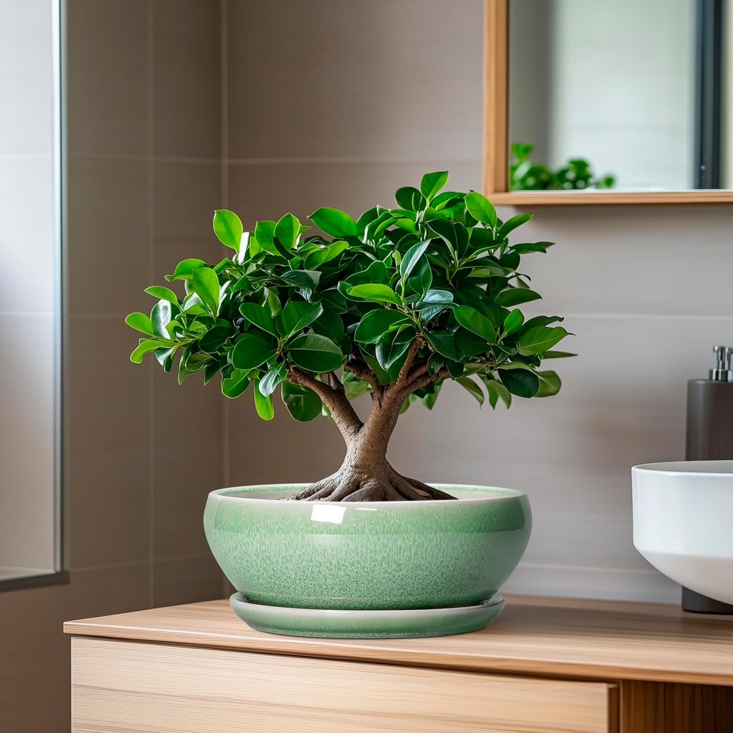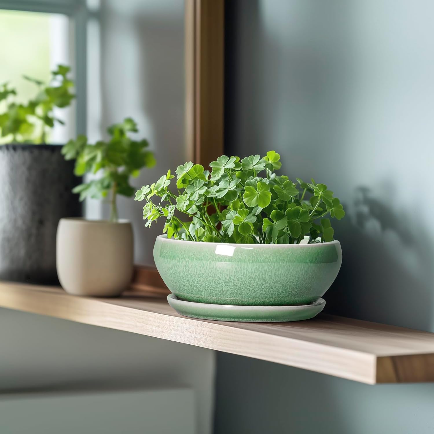 SQOWL Bonsai Planter - 8 Inch Ceramic Succulent Planters for Indoor Plants Outdoor, Shallow Round Planter with Drainage Hole and Saucer, Ceramic Bowl Planters, Home Decor, Birthday Gifts, Green