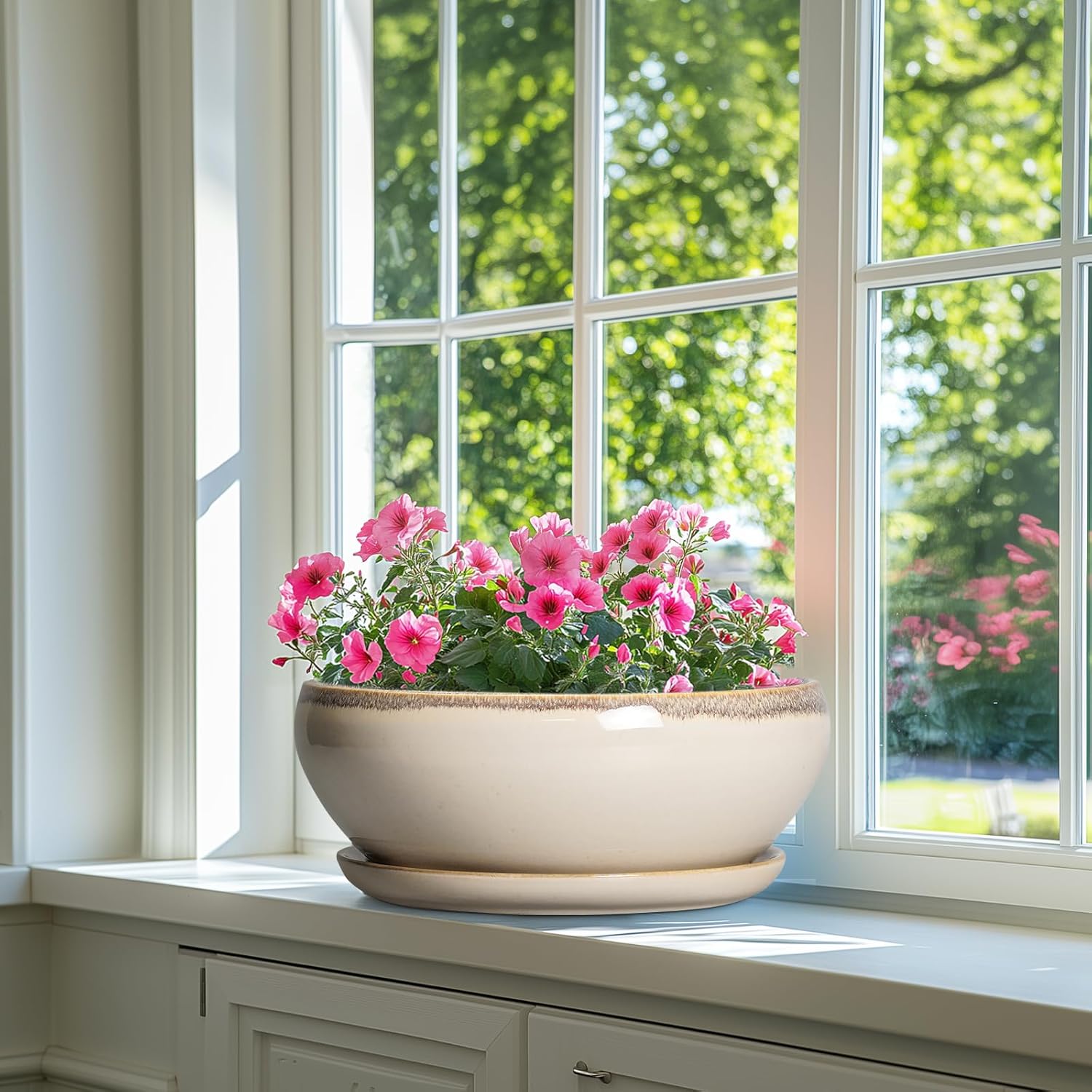 SQOWL Bonsai Pots 12 Inch - Large Ceramic Succulent Planters, Shallow Planter with Drainage Hole and Saucer, Round Bowl Planter for Indoor Outdoor Plants, Home Decor, Plant Lover Gifts, Beige