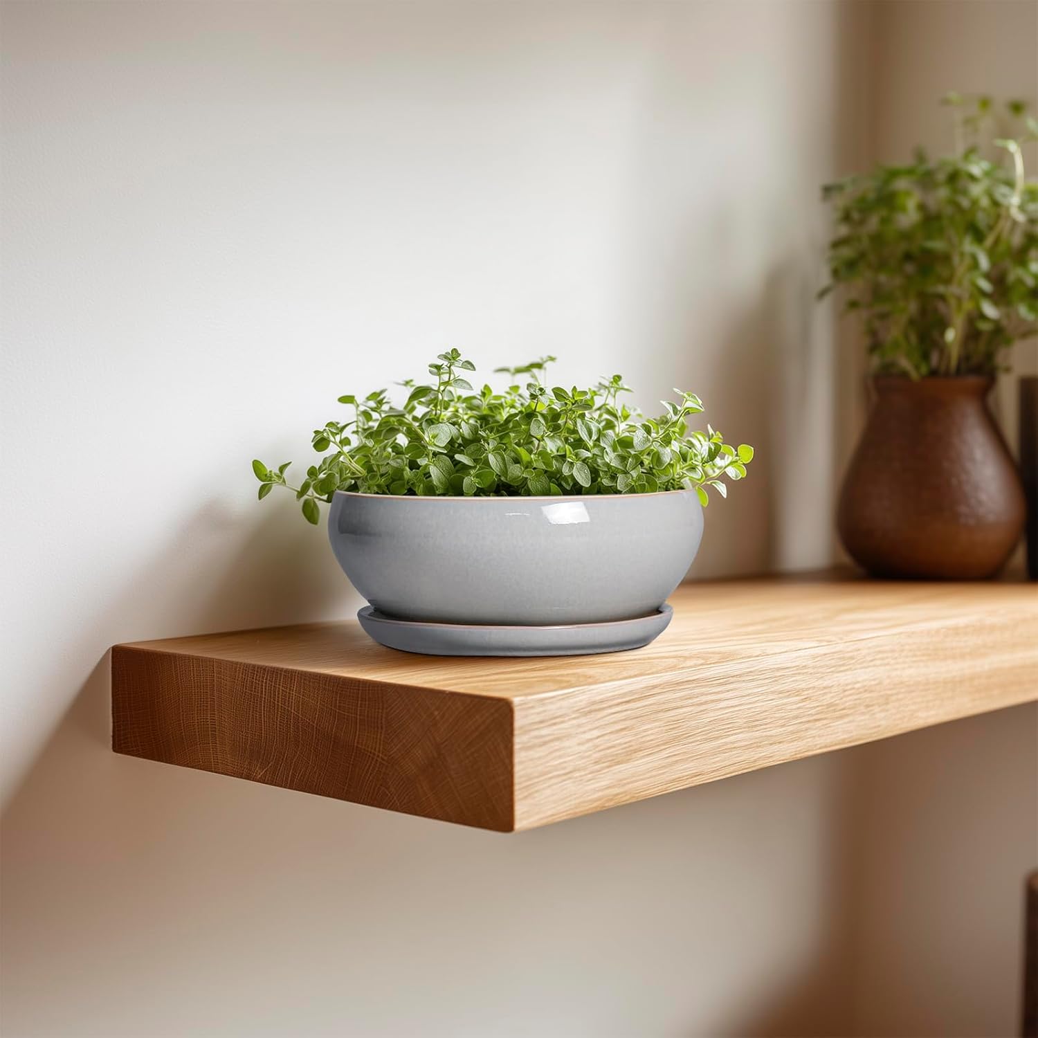 SQOWL Succulent Planters 6 Inch - Ceramic Bonsai Pots with Drainage Hole and Saucer, Shallow Planter for Indoor Plants Outdoor, Round Ceramic Pots for Plants Cactus, Room Decor, Garden Gifts, Gray