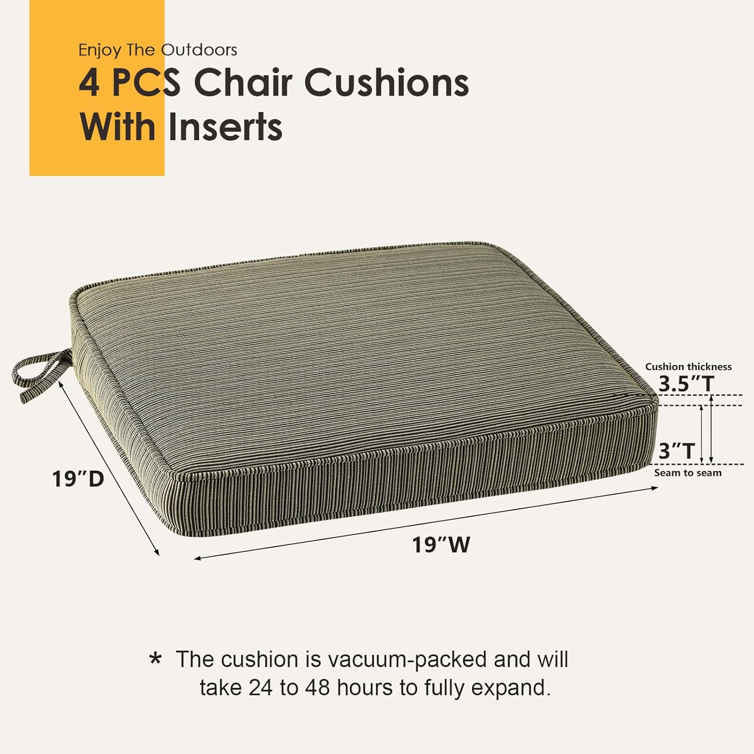 - Chair Cushion Set of 4: Each pack includes 4 Chair cushions measuring 19"W x 19"D x 3"T. Measure the seating area of your furniture to ensure their size is right.