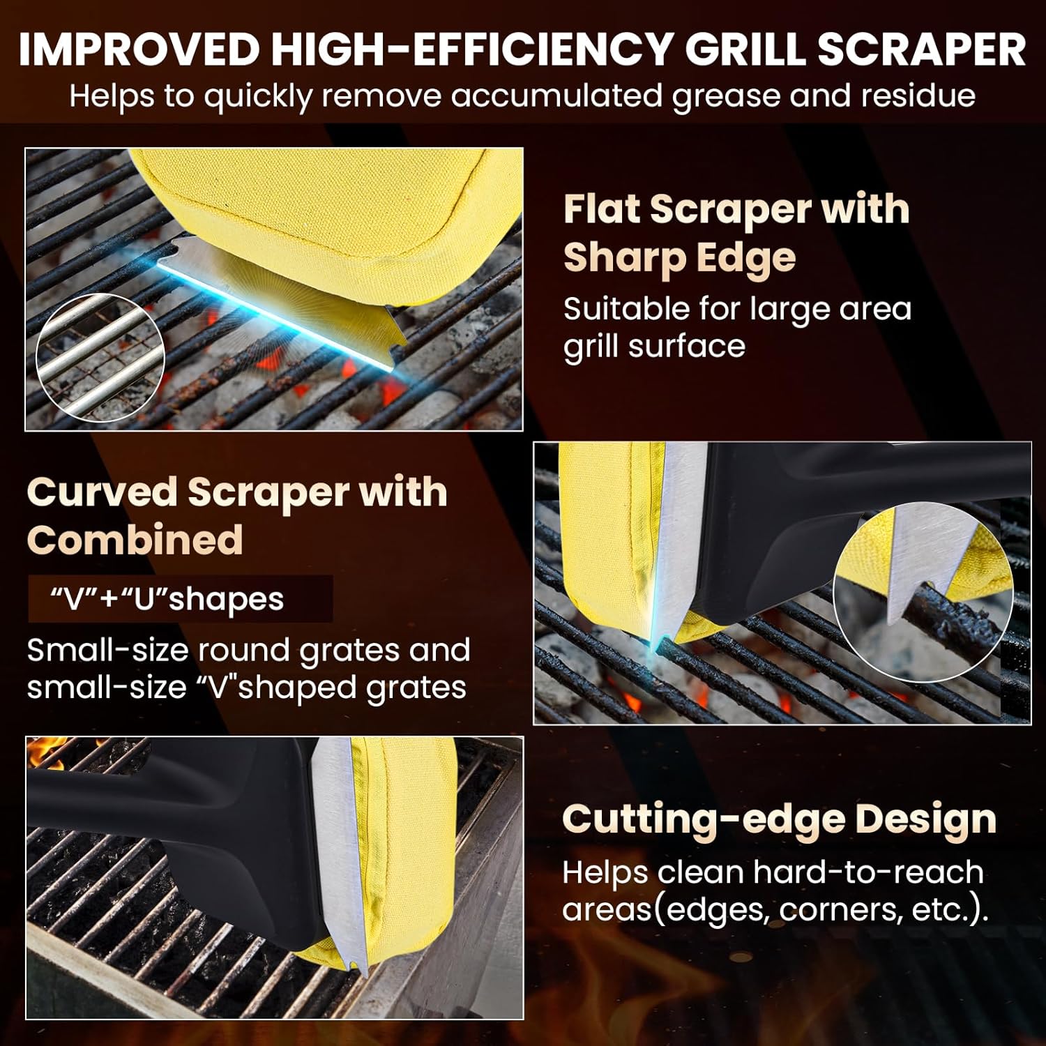 - 4. 【Universal Fit & Ergonomic Design】Reach Every Corner The all-in-one grill brush with scraper fits most grill types (gas/charcoal/smokers). Angled head + extended heatproof handle access curved racks and tight gaps, revolutionizing your brush for grill cleaning experience.
