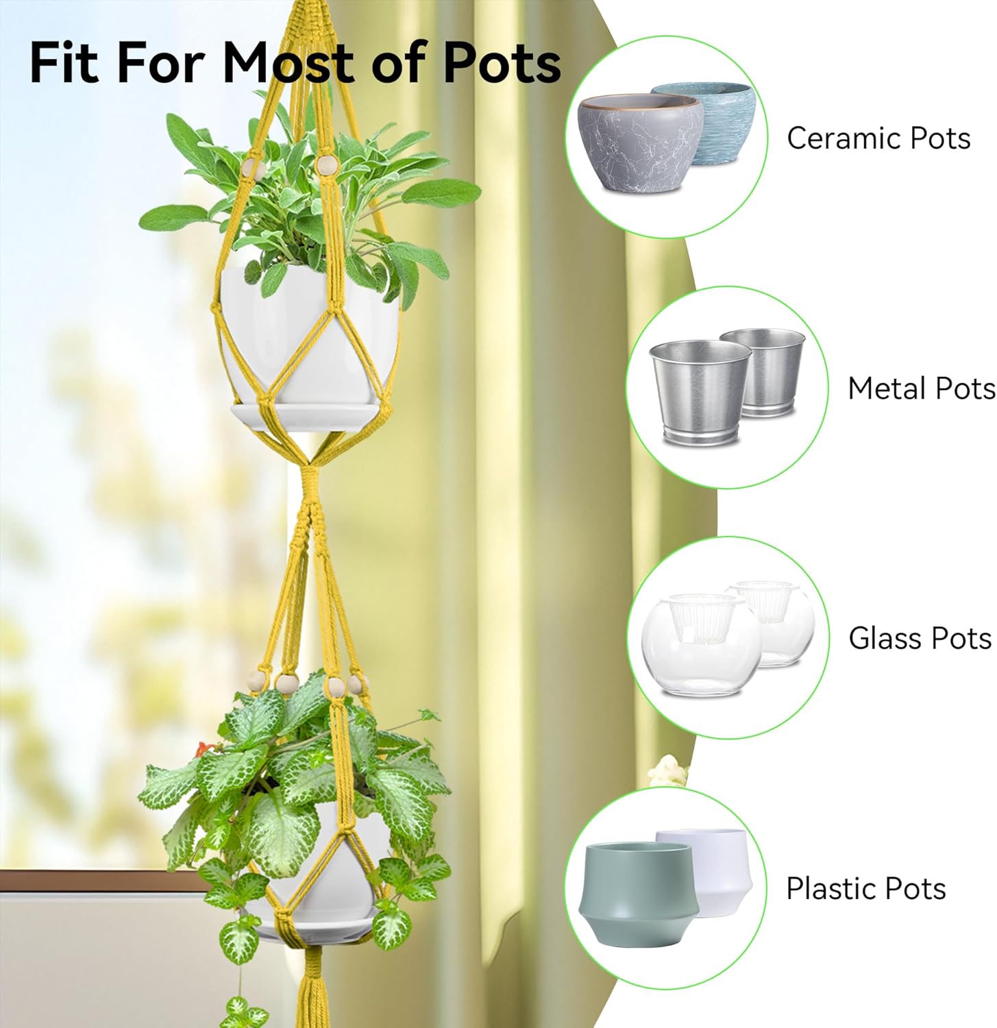 USLAI Macrame Plant Hanger Indoor Outdoor, Up to 4-15 inch Pot, Heavy 20lb Planters, Extra Long Strong Hanging Planter Basket Holder, Boho Home Decor, 49+72 Inch, Yellow (POTS NOT Included)