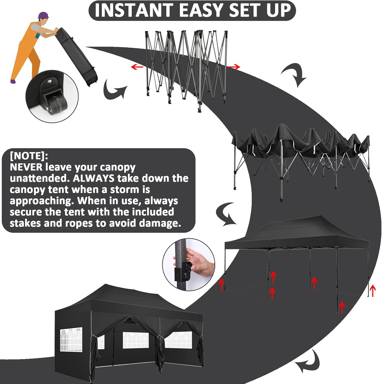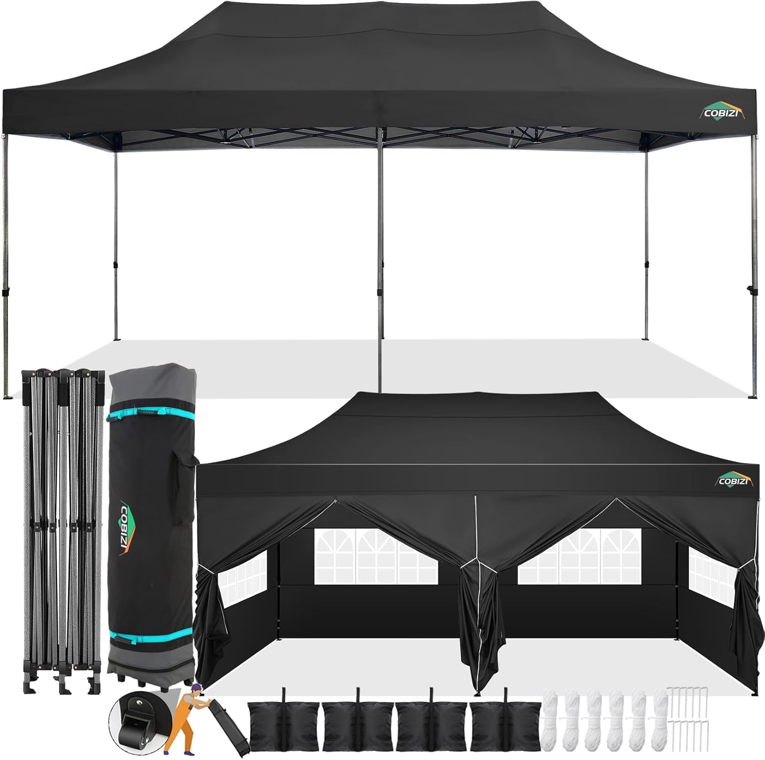 COBIZI 10x20 Pop Up Canopy with 6 Sidewall,Heavy Duty Canopy UPF 50+ All Season Wind Waterproof Commercial Outdoor Wedding Party Tents for Parties Gazebo with Roller Bag(10 x 20 ft Black)