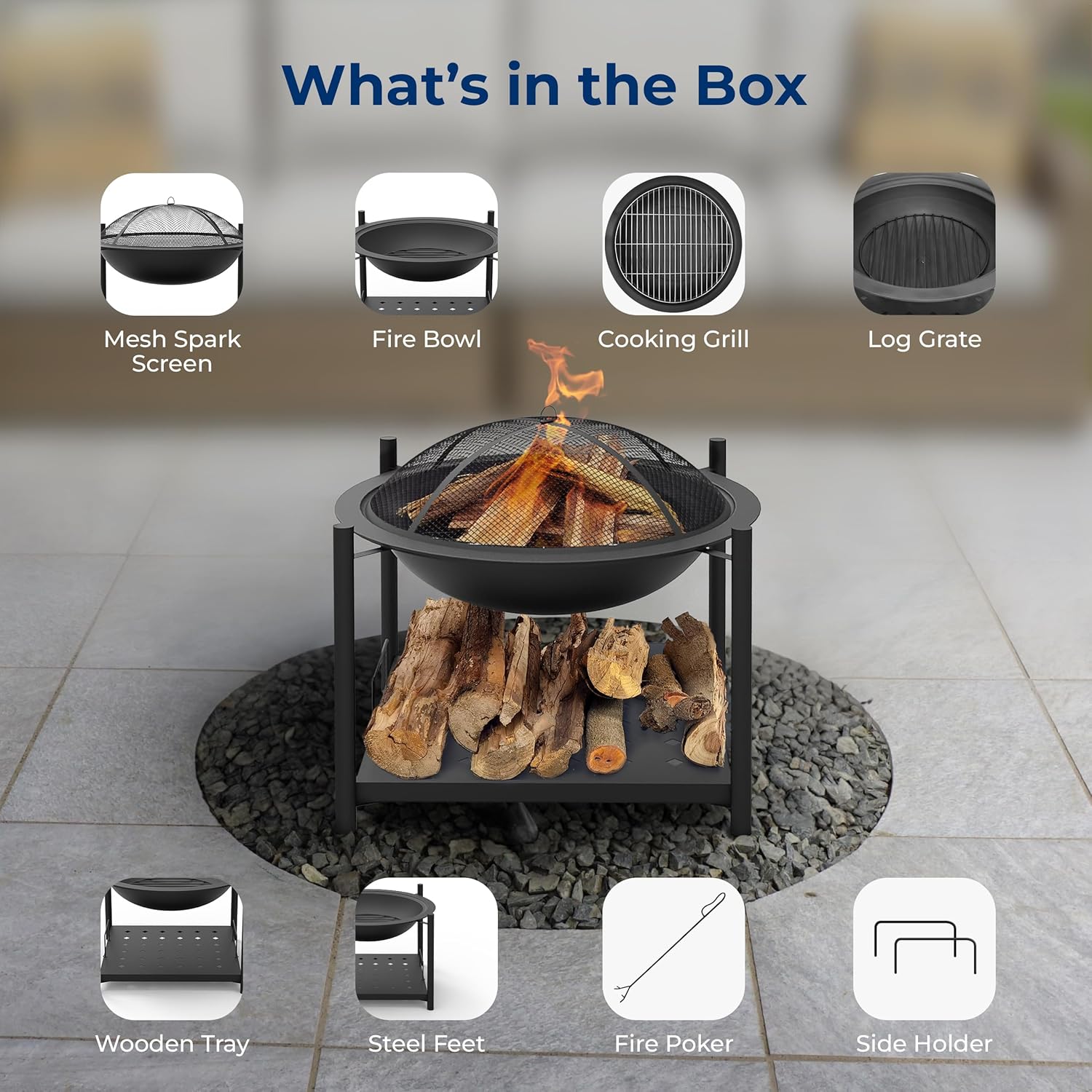 - SAFE AND RELIABLE DESIGN: The outdoor fire pit includes a mesh spark screen to protect against flying embers, ensuring safety. A fire poker is also included, making it easier to manage the fire. Itโs a secure and worry-free way to enjoy your bonfire.