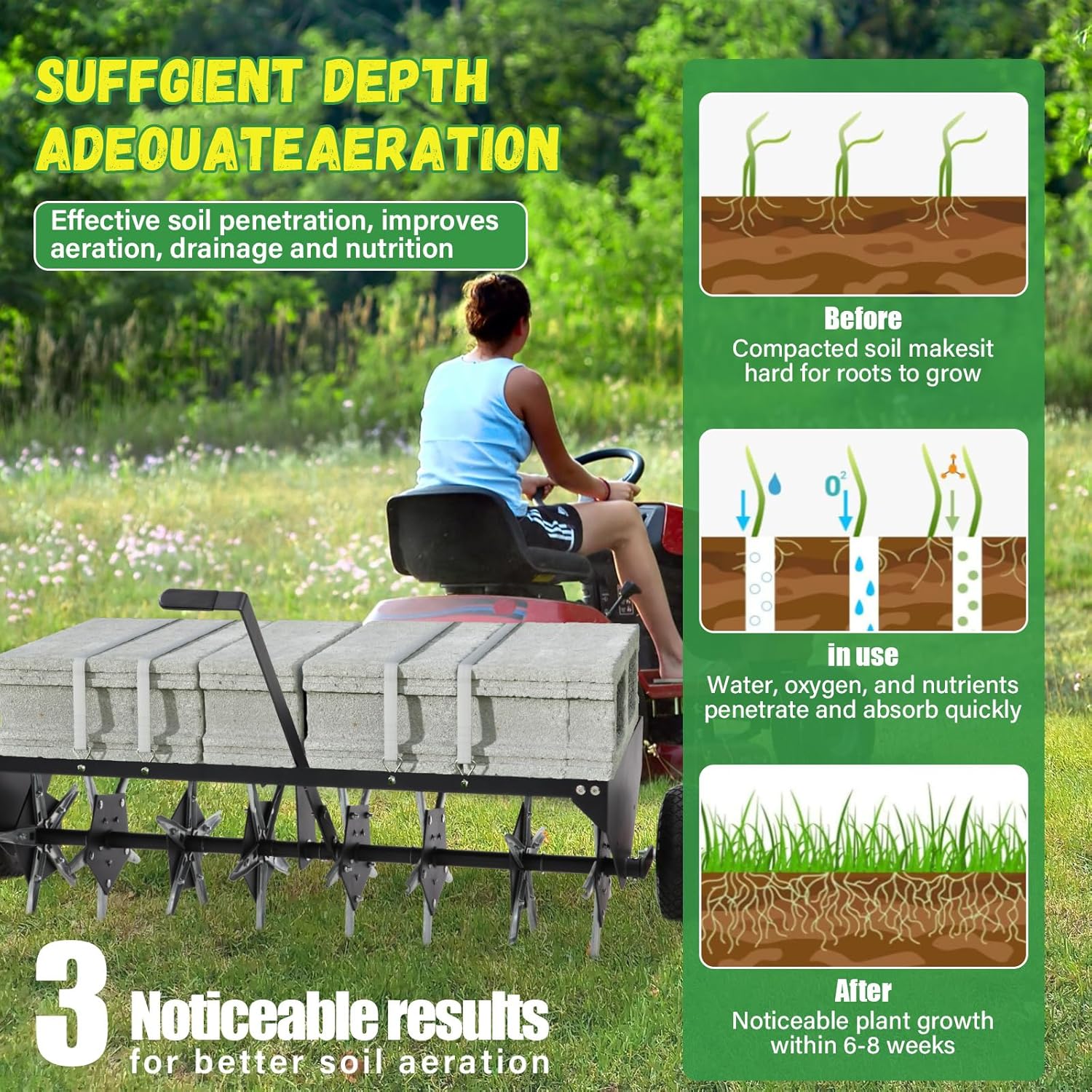 - 【Durable Design】-This tow behind aerator is made of high quality and durable all-steel design, equipped with 40 galvanised steel plug teeth and high-strength adjustable 6 mm thick bracket prevents bending to make the product durable.