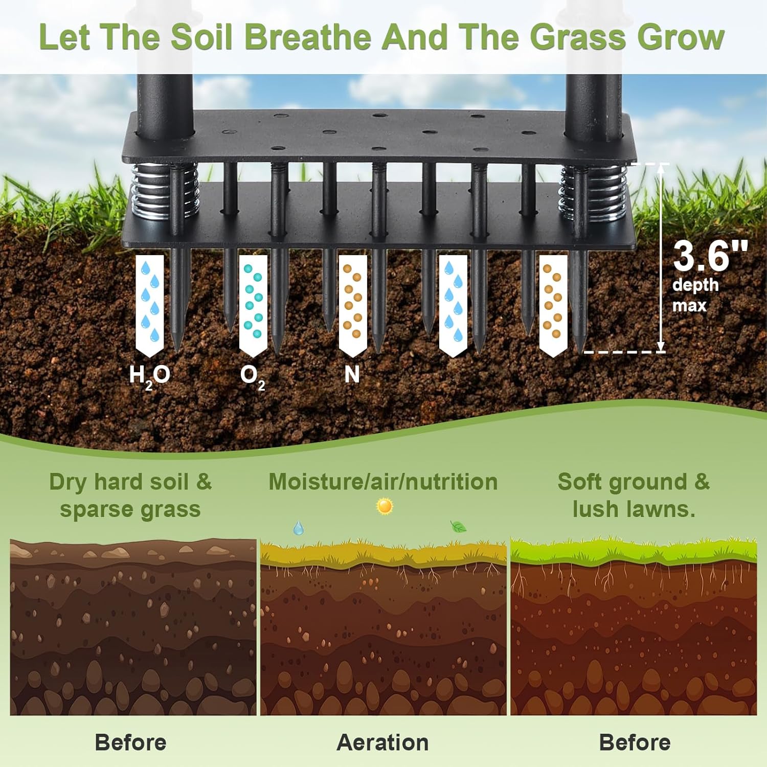 - Self-cleaning-The aerator lawn tool is designed with a double spring base plate that automatically strips the soil from the spike teeth when the end of the aerator is pulled out, without damaging the lawn, for effective yard aerator