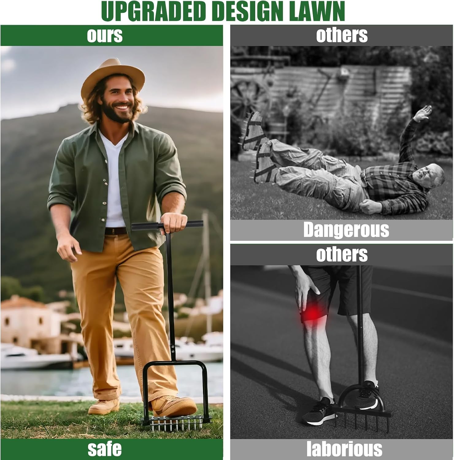 - Durable Yard Lawn Aerator:This lawn aerator is made from high-quality, thickened iron, finished with precision spray painting and arc welding to ensure durability and rust resistance. Say goodbye to flimsy plastic/metal aerator soles and unstable spikes—no need to worry about resizing or breakage.