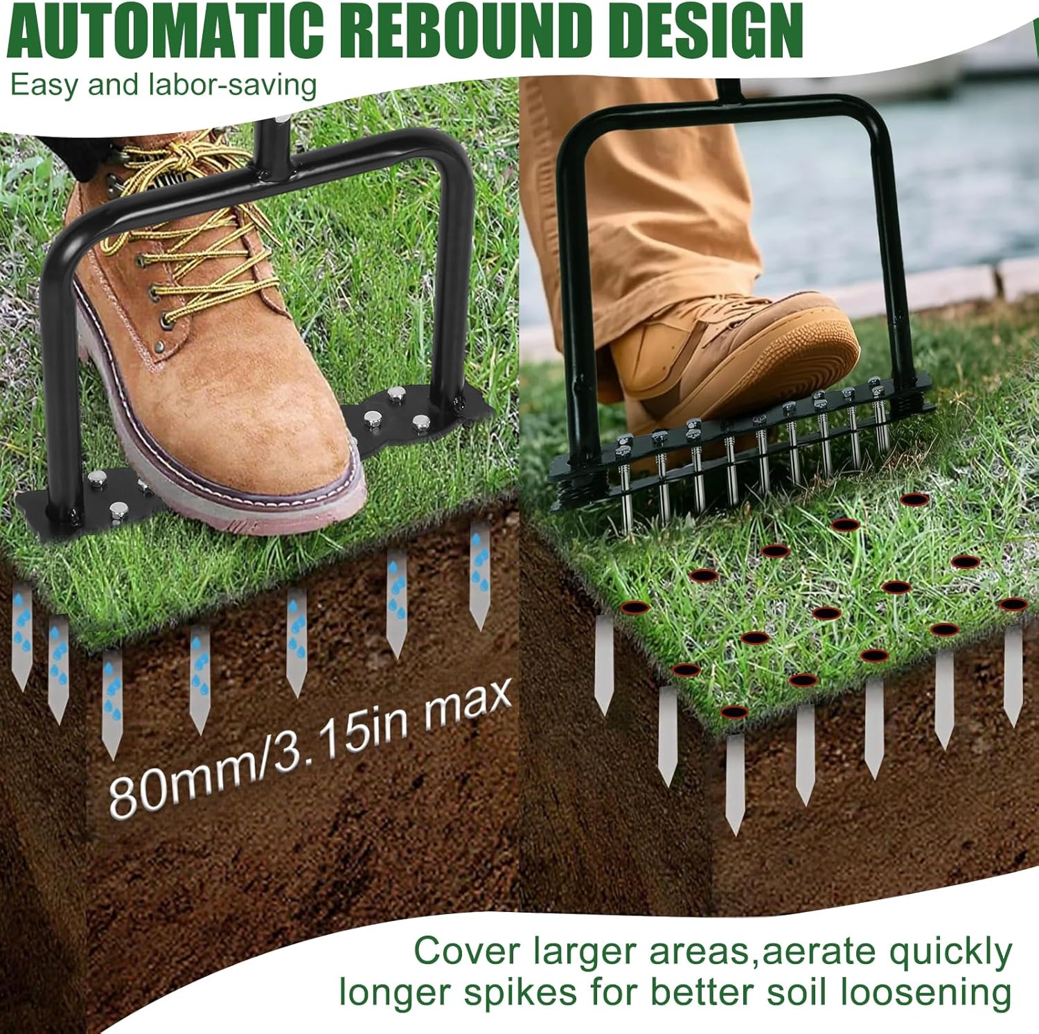 - Dual Spring Design: The TfruKiet lawn aerator features an innovative dual-spring design, eliminating the common hassle of manually removing soil and dry leaves after aerating. This ensures a smooth, efficient, and time-saving aeration process, promoting optimal lawn growth without compromising soil integrity.
