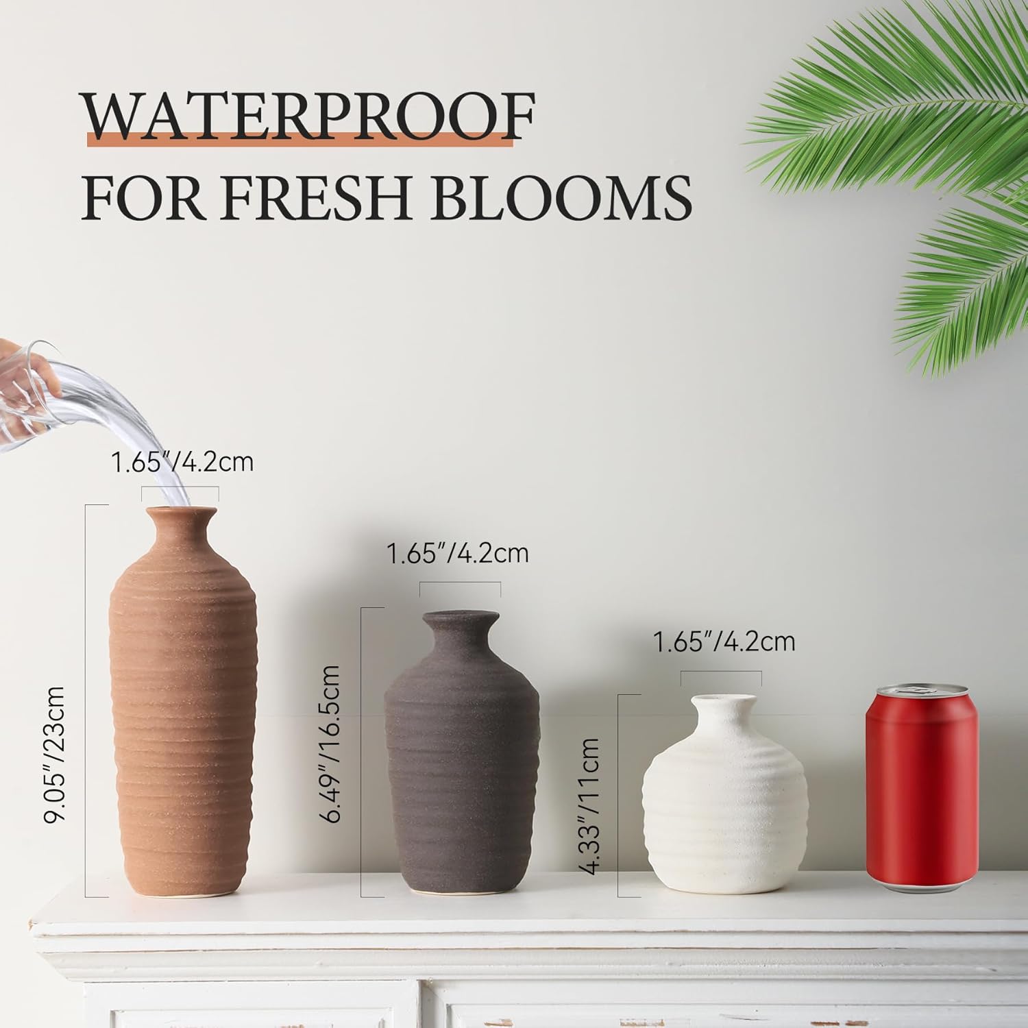 Ceramic Vase Set of 3 Neutral Decorative Vase for Farmhouse, Boho, or Rustic Home Decor Pottery Vases for Pampas Grass Living Room Bedroom Table Mantel Entryway Shelf (01-Brown)