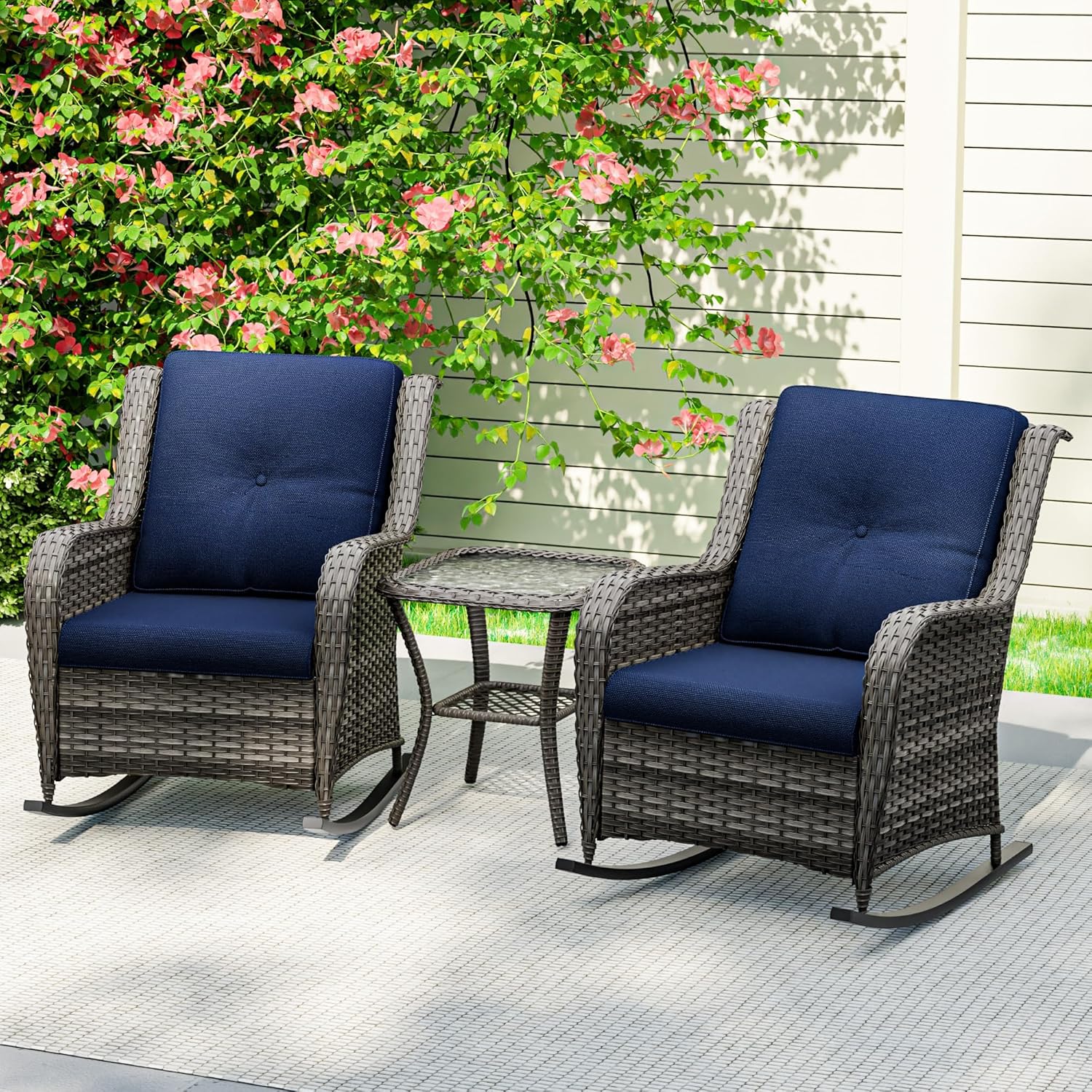 3 Piece Outdoor Rocking Chair Bistro Set, Wicker Patio Furniture Set Includes 2 Chiars and 1 Side Table, for Yard, Porch, Mixed Brown Grey Rattan, Blue