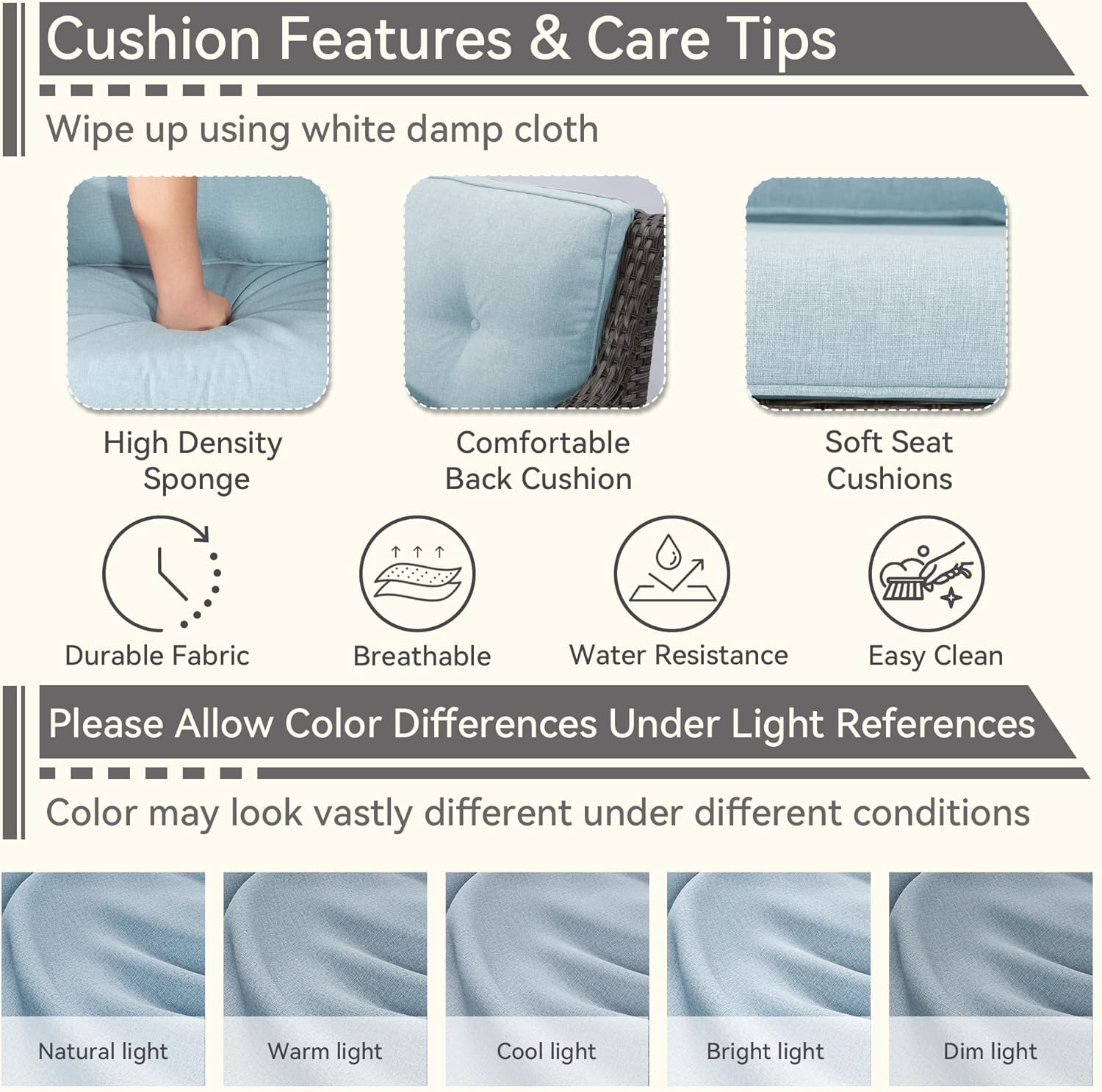 - [Easy-Clean Cushions] Wipe with a white damp cloth for easy clean. Allow for color differences in different ambient light and displays