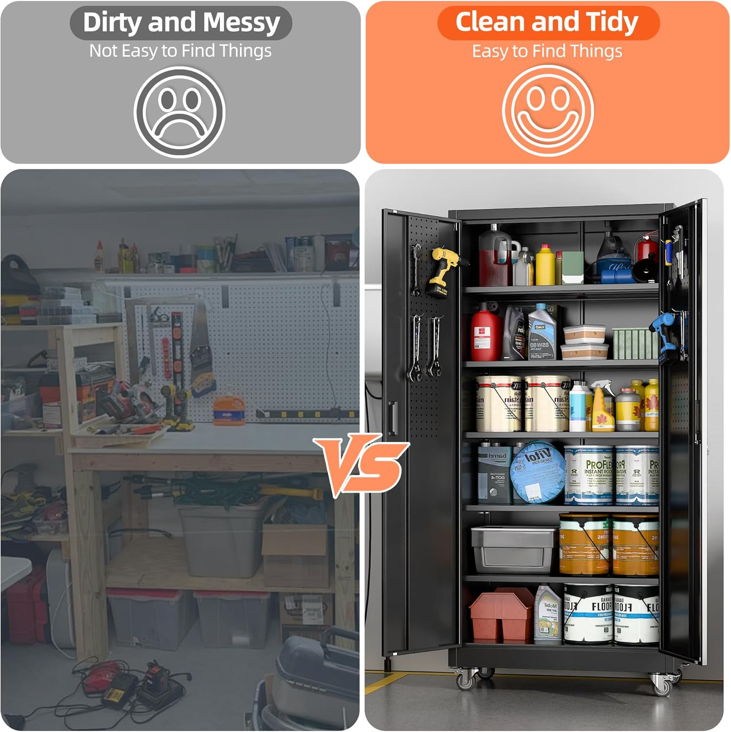 - Ample and Flexible Storage Solutions:This garage storage cabinet with wheels offers generous storage space with 5 adjustable shelves, allowing you to customize the interior layout according to your specific needs. Whether storing large tools, boxes, or small items, the shelves can be easily repositioned. The multifunctional pegboard on the doors adds another layer of storage versatility, perfect for hanging tools, accessories, or other frequently used items. Plus, it comes with four hooks for additional hanging options, keeping your space organized and clutter-free;