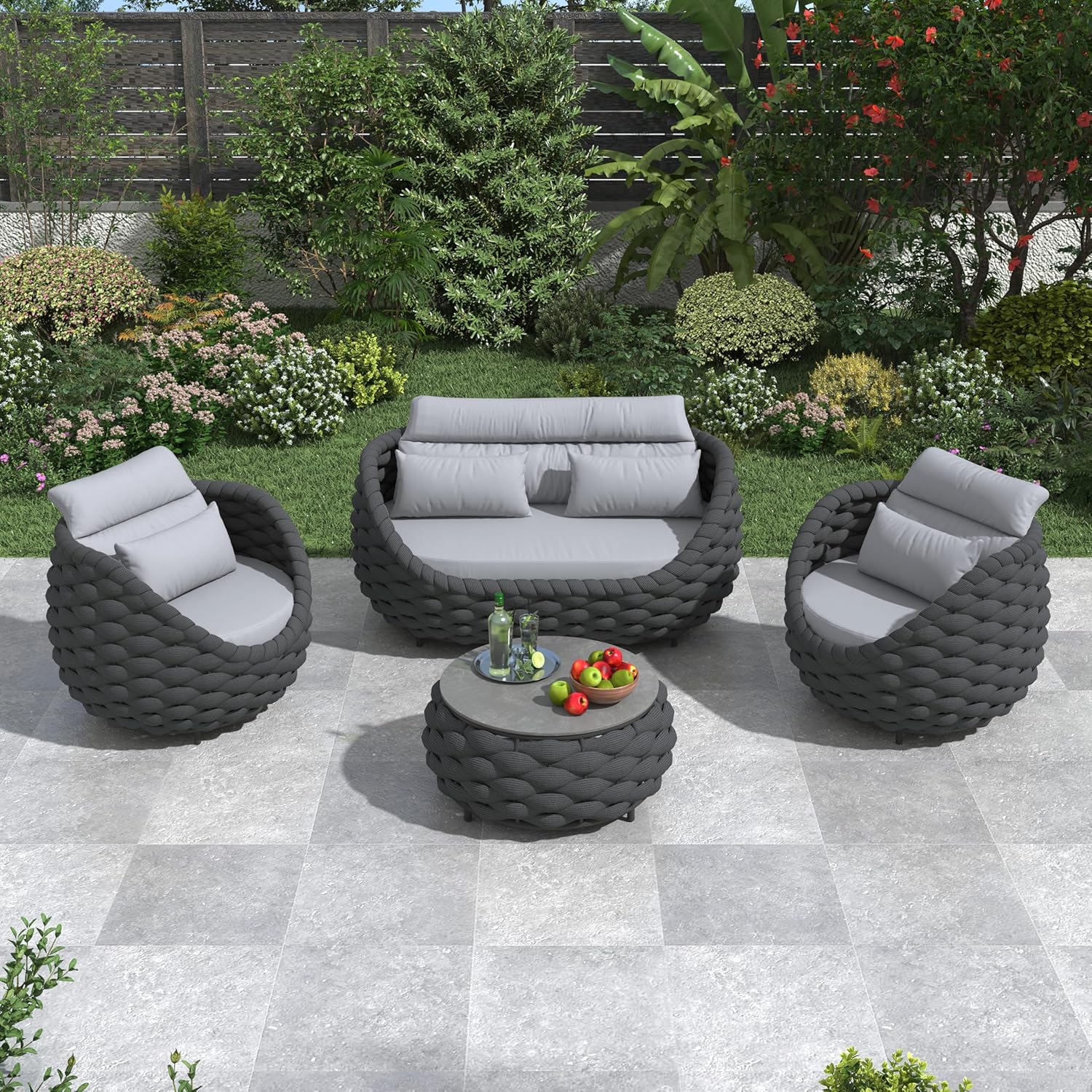 4-Piece Woven Rope Outdoor Seating Set: Alumunim Frame, No Assembly, All-Weather Accent Patio Furniture - Modern Garden Lounge Conversation Set for Backyard Deck Porch Poolside Hotel