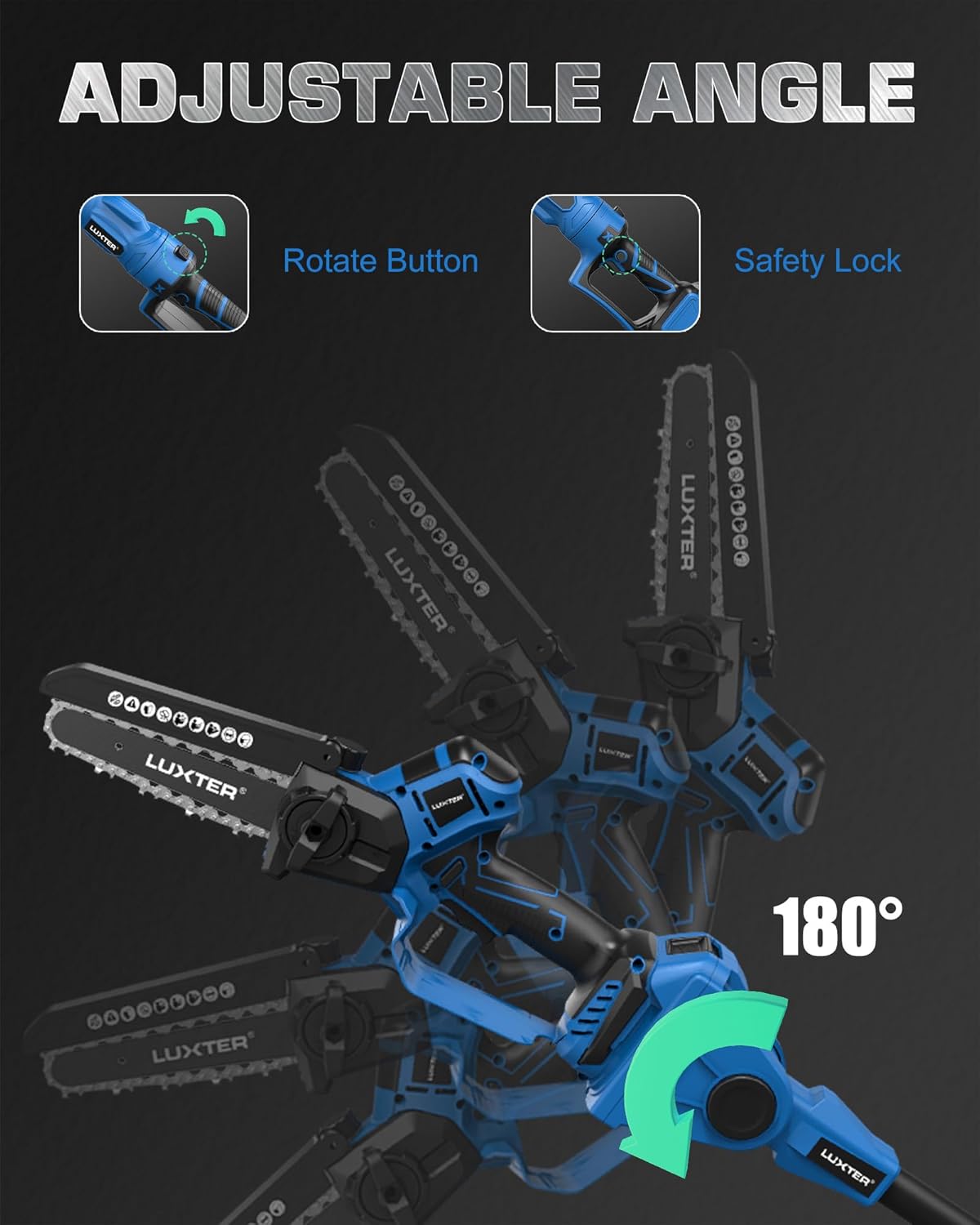 - 【PACKAGE AND WARRANTY】: LUXTER guarantees a 12-month product warranty. If you have any questions, please feel free to contact us at any time. In the package, you will receive: 1 x cordless 6-inch mini chainsaw, 1 x hedge trimmer, 1 x telescopic pole, 2 x 20v 2.0Ah battery packs, 1 x charger, and 1 x instruction manual