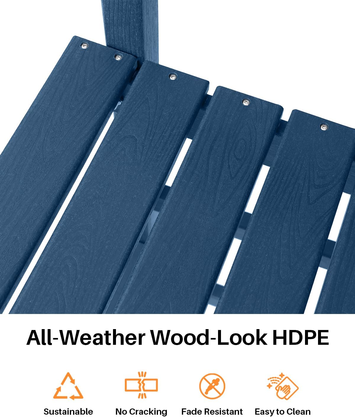 - Weather-Resistant HDPE Build: Constructed from durable HDPE lumber with a natural wood-grain look, this set resists fading, cracking, and warping through sun, rain, and snow. Ideal for pool decks and breezy balconies, the slatted seat design drains water quickly, while the deep navy color holds its richness over time.