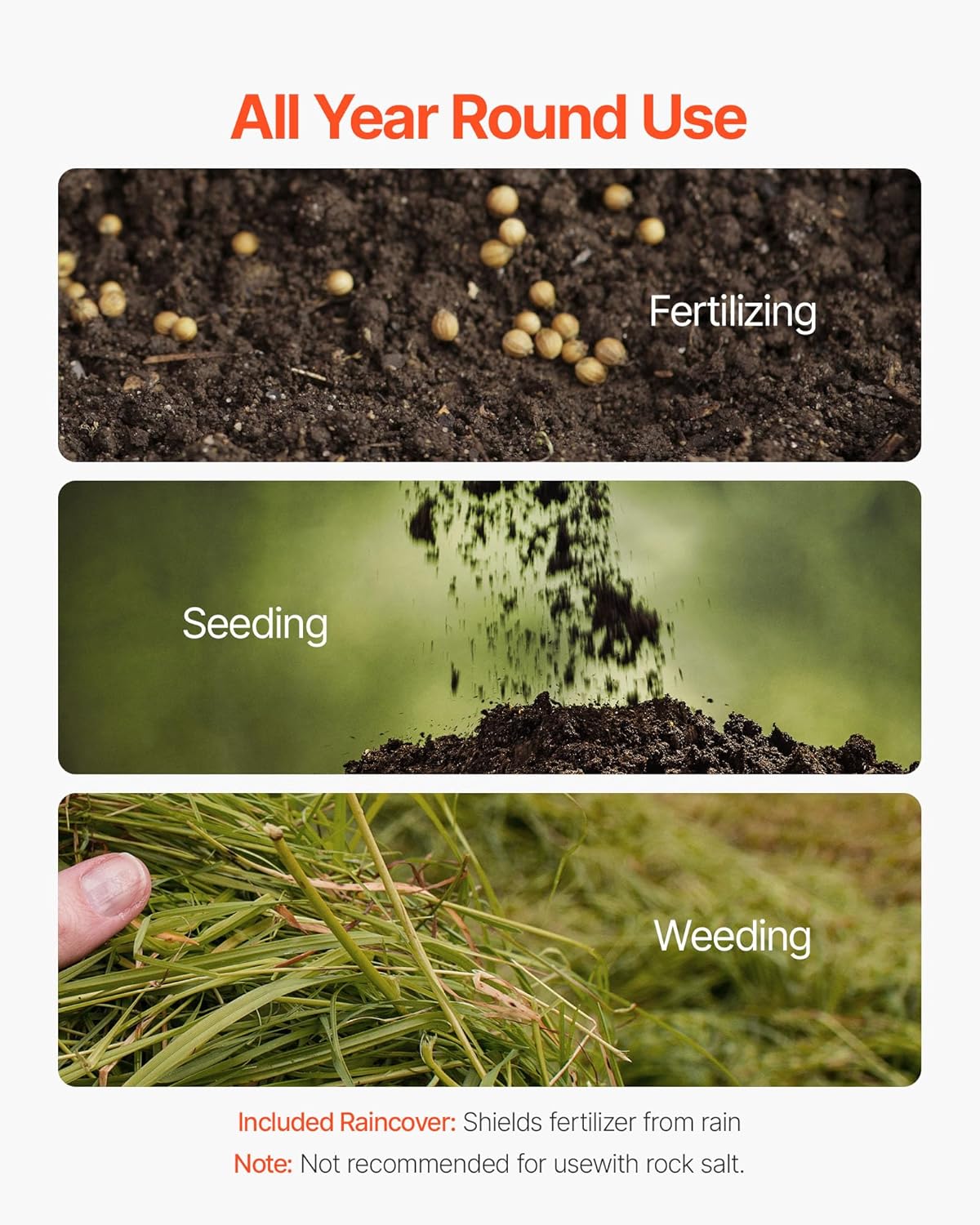 - All-Year-Round Versatility: Our garden seed spreader deal for spring seeding, summer fertilizing, and winter salting, replacing four tools with one. Suitable for home lawns and small farms.