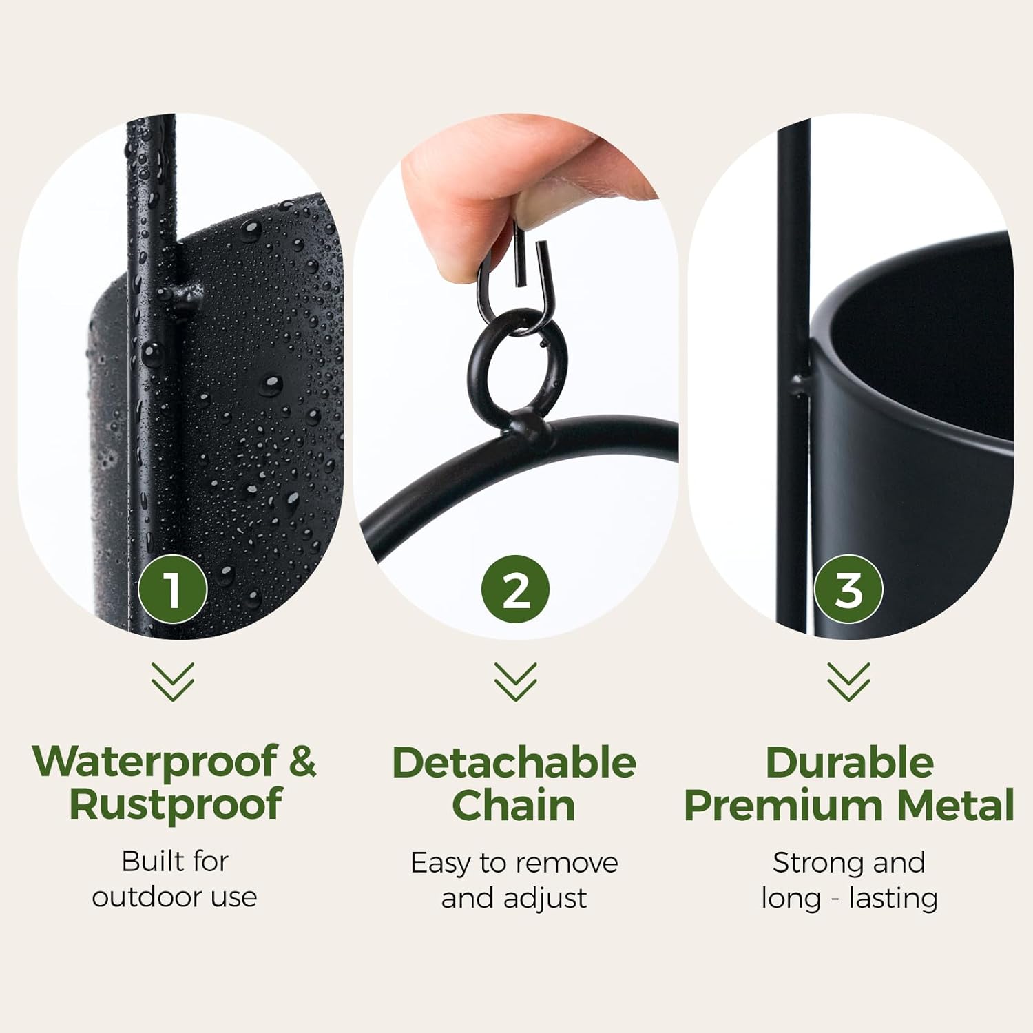 - Rustproof & Waterproof Finish – The sleek powder-coated surface protects against water and rust, ensuring your hanging pots for plants indoor or hanging baskets for plants outdoor stay beautiful and functional season after season.