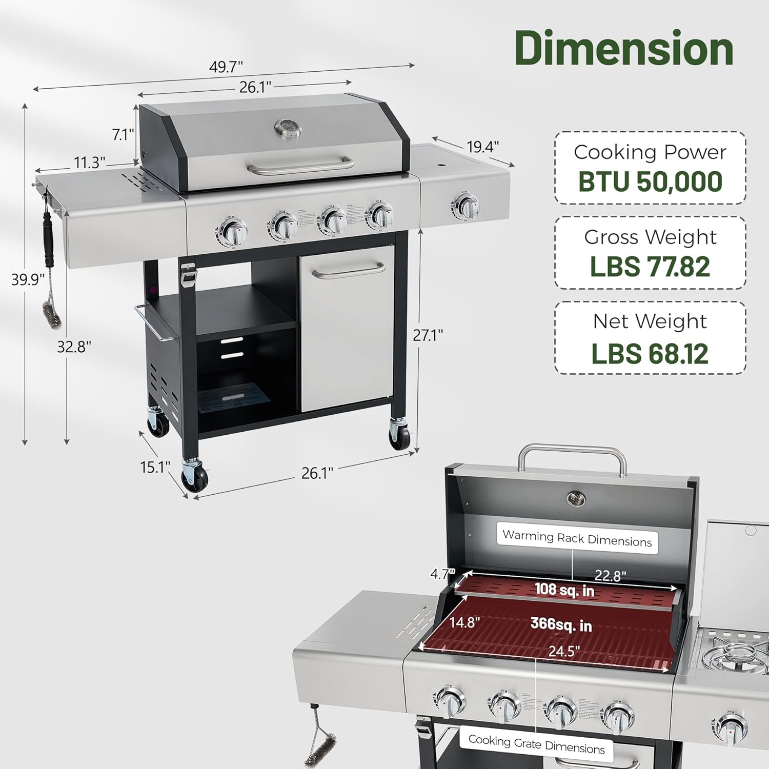 - 50,000 BTU HIGH-EFFICIENCY POWER: This gas grill delivers up to 50,000 BTUs of power (with four 10,000 BTU main burners and a 10,000 BTU side burner). Whether you're searing steaks or slow-cooking ribs, this propane grill ensures faster heating and exceptional cooking performance to meet all your grilling needs