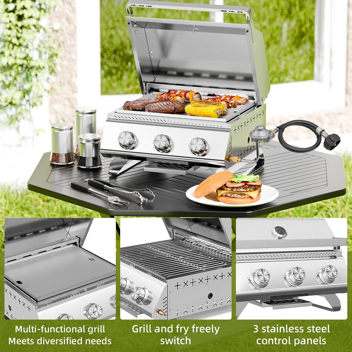 3-Burner 24,000 BTU Portable Flat Top Propane Gas Grill, Heavy-Duty Stainless Steel 2-in-1 Tabletop Grill and Griddle Combo for Commercial BBQ, Outdoor Cooking, Camping,Tailgates & Backyard