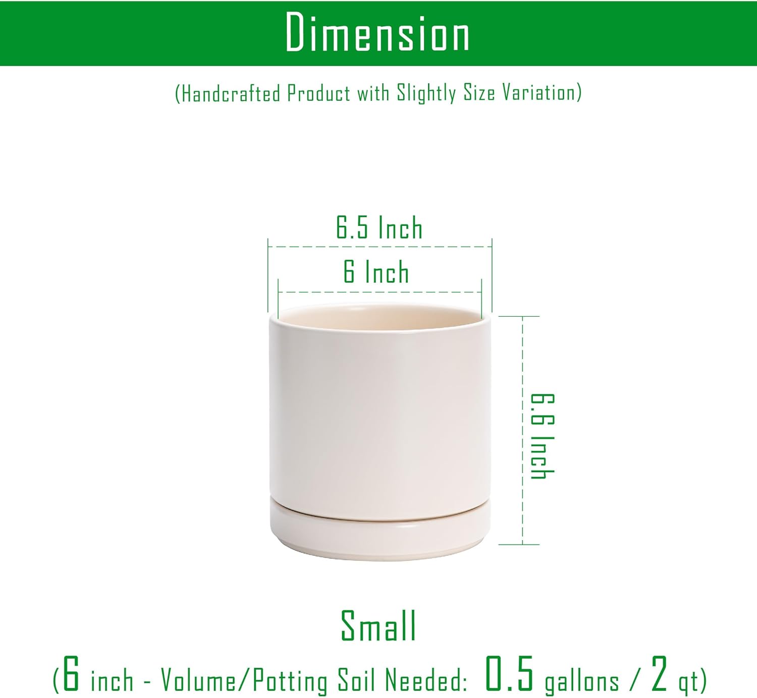 - Pack of 2 Planter Pots: 6.5" Diameter (6" Inner Diameter) * 6.6" Height. Potting Soil Needed: 0.5 gallons / 2 qt.